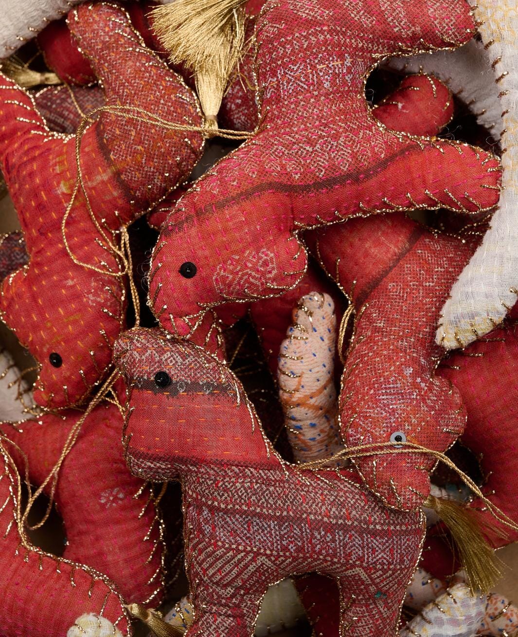 Schaukelpferd-Ornament von Sissel Edelbo, hergestellt aus Resten von Kantha-Decken. Jedes Schaukelpferd ist handgefertigt mit der Kantha-Sticktechnik, die alte Baumwoll-Saris wiederverwendet.