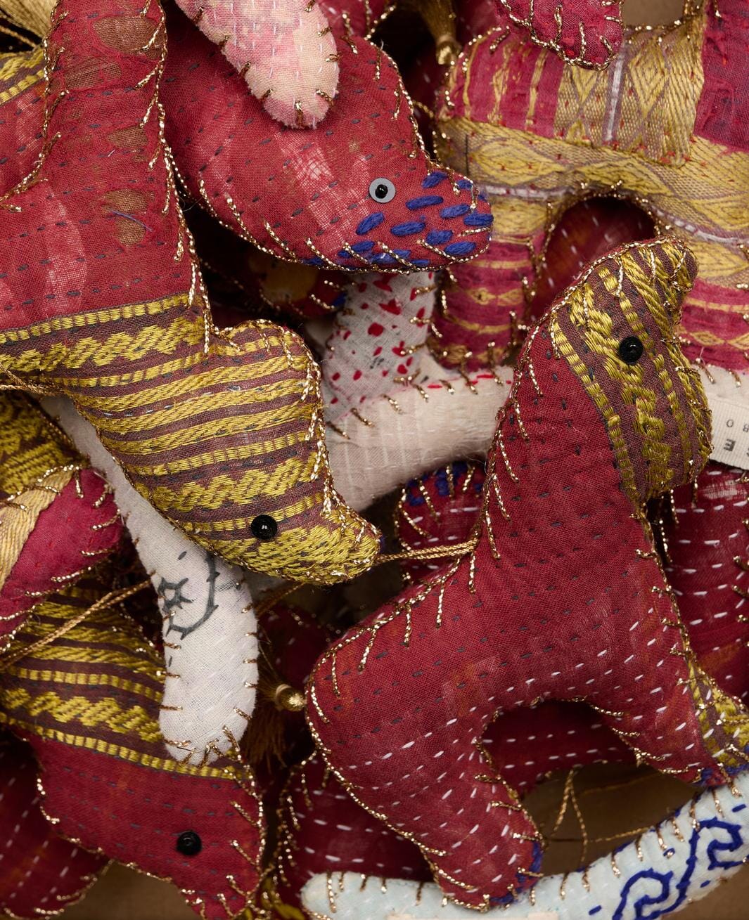Ein Schaukelpferd-Deko von Sissel Edelbo, hergestellt aus Resten von Kantha-Decken. Die Kantha-Sticktechnik recycelt alte Baumwoll-Saris und verleiht der Deko ihren handgemachten Look.