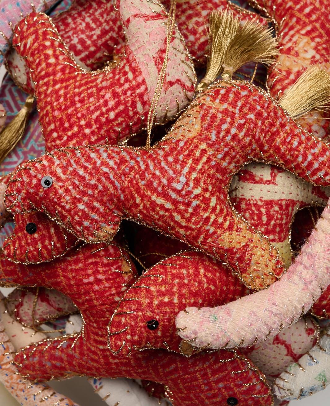 Schaukelpferd-Ornament von Sissel Edelbo, hergestellt aus Resten von Kantha-Decken. Das Ornament hat ein rotes und weißes Muster mit einer goldenen Quaste als Schweif.