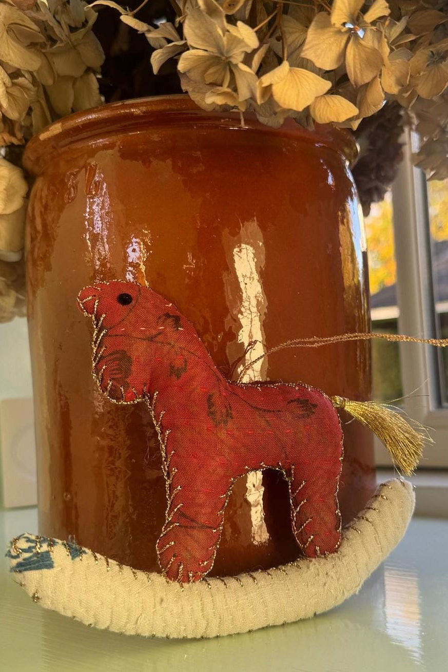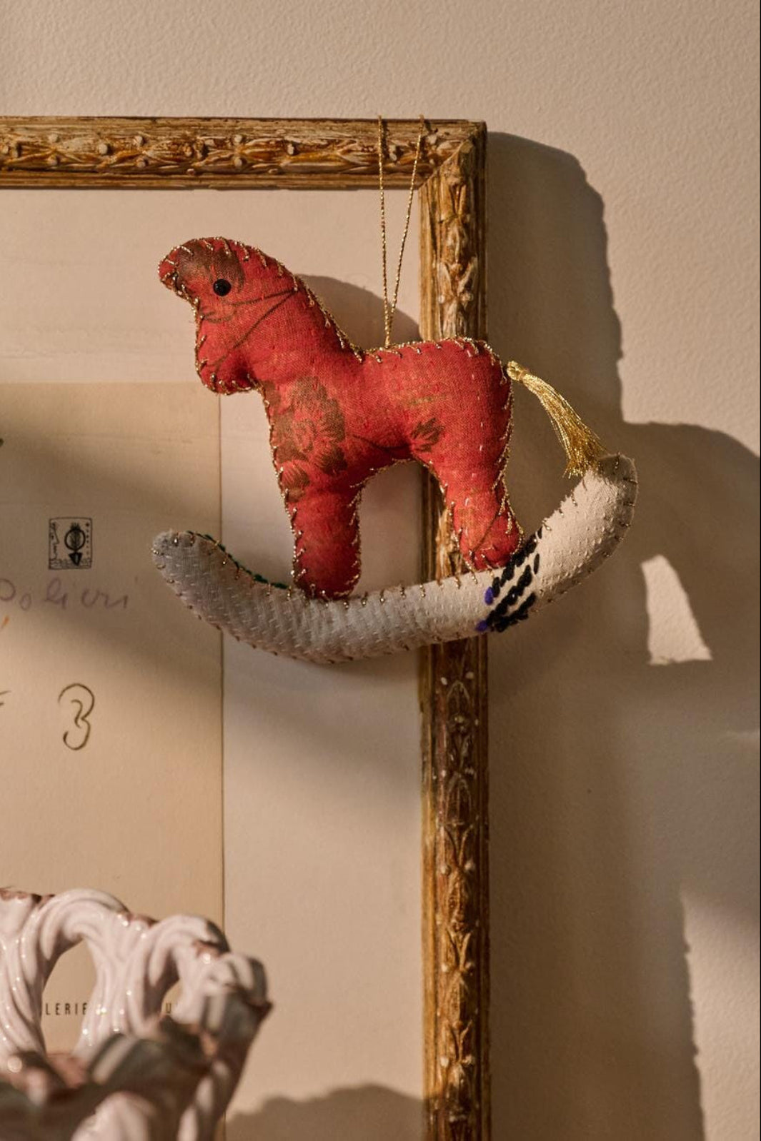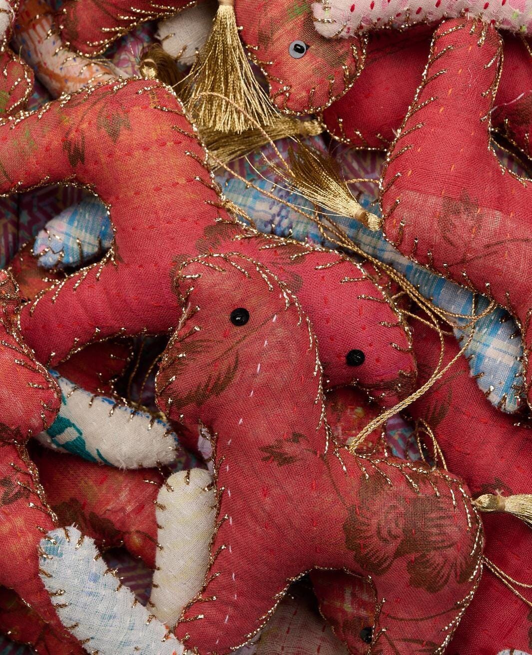Schaukelpferd-Ornament von Sissel Edelbo, hergestellt aus Resten von Kantha-Decken. Jedes Ornament hat einen roten Körper mit weißem Untergrund und eine goldene Quaste.