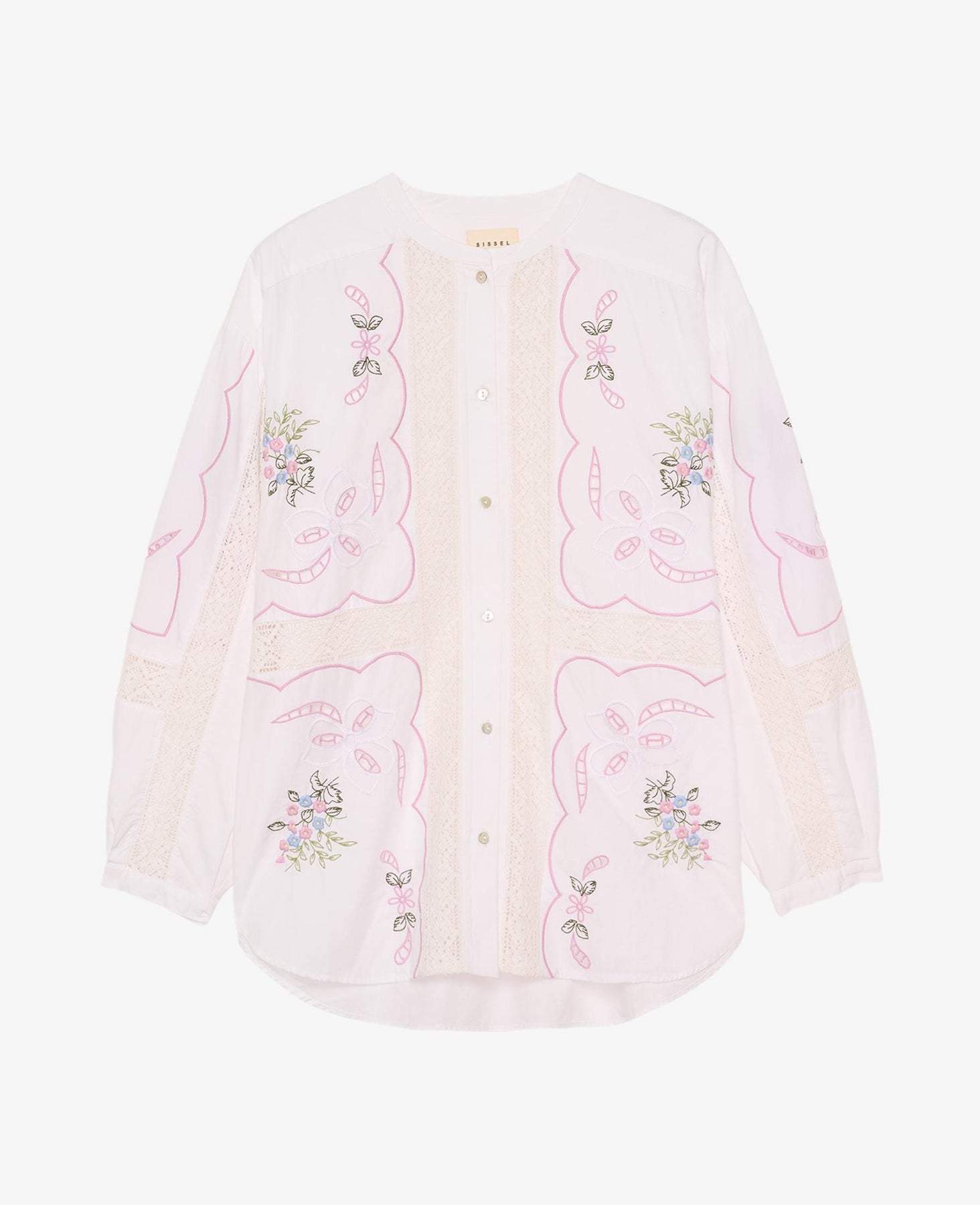 Weiße Bluse von Sissel Edelbo mit bestickten Blumenmotiven in Pastellfarben und Spitzendetails. Die Bluse hat eine lockere Passform und besteht aus Bio-Baumwolle.