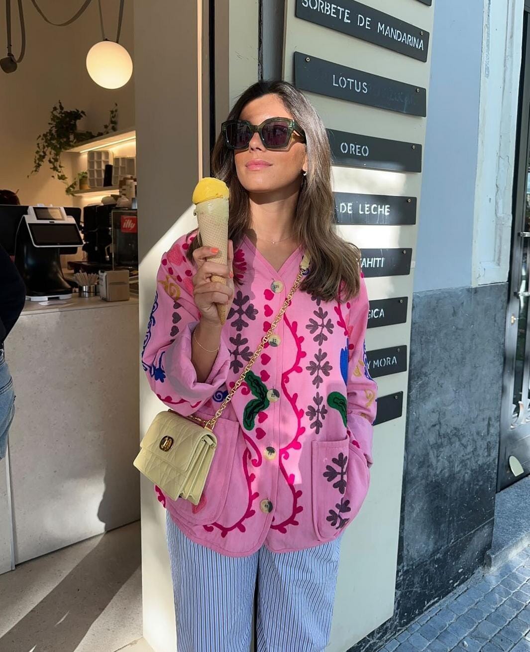 Rosa Jacke von Sissel Edelbo mit gestickten Blumen- und Naturmotiven. Die Jacke hat eine lockere Passform mit zwei Vordertaschen und Knopfverschluss vorne.