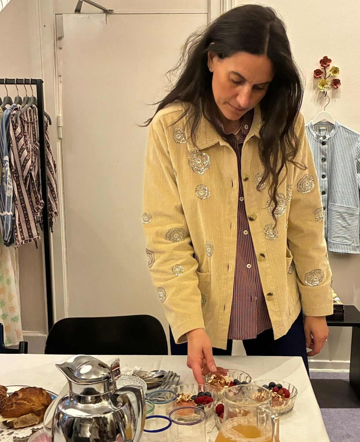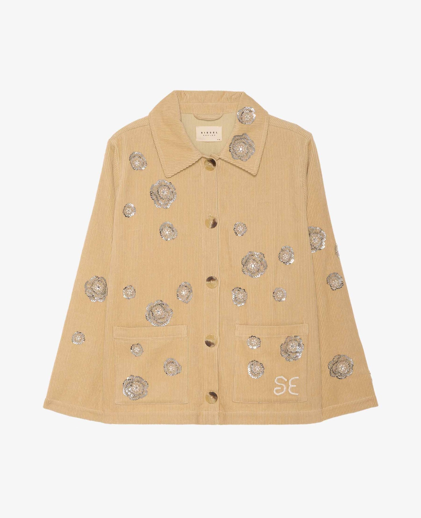 Beige Jacke von Sissel Edelbo, gefertigt aus überschüssigem Cord. Die Jacke ist mit Pailletten und Perlenrosetten in verschiedenen Größen verziert, die in einem unregelmäßigen Muster angeordnet sind.