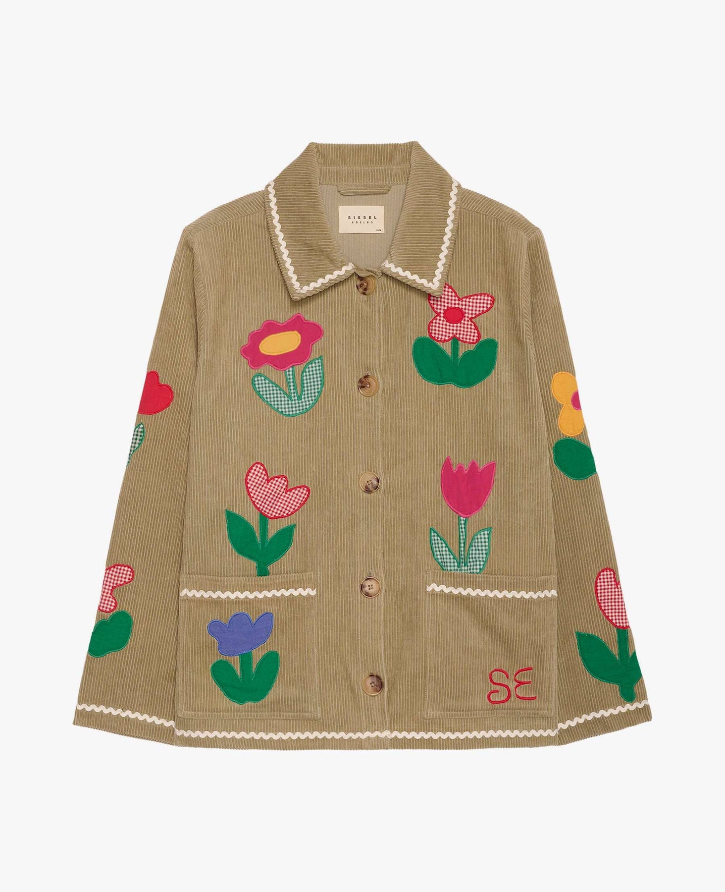 Jacke von Sissel Edelbo, gefertigt aus überschüssigem Cord in einem grünen Farbton. Die Jacke hat eine lockere Passform mit kleinem Hemdkragen und langen Ärmeln.
