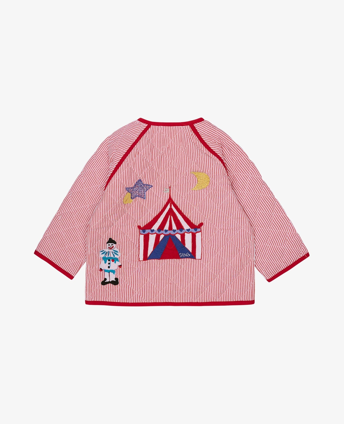 Gesteppt Jacke aus rot-weiß gestreifter Baumwolle mit Zirkusmotiven. Das Design hat handgefertigte Details mit Stickerei, Perlen und Pailletten, die der Jacke einen künstlerischen Touch verleihen.