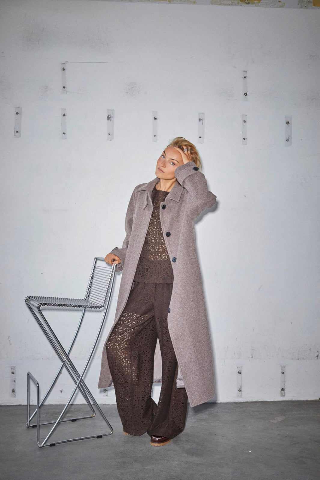 Langer Mantel von Sisters Point in braun melierter Farbe. Der Mantel besteht aus einer Mischung aus Polyester, Acryl und Viskose.