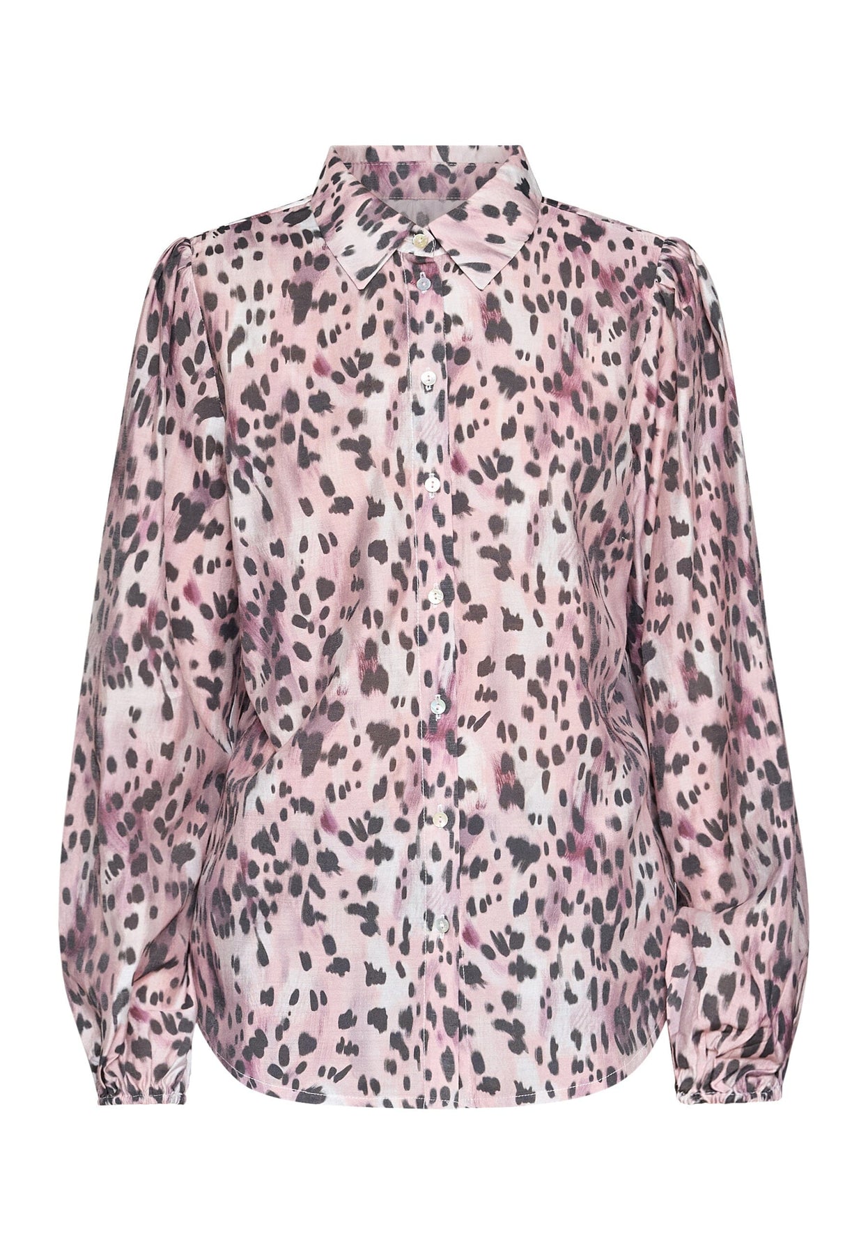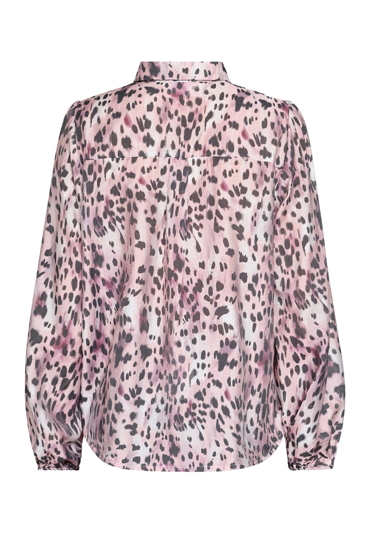Bluse von Sisters Point mit Animalprint in rosa und schwarzen Nuancen. Die Bluse hat eine Knopfleiste vorne und einen klassischen Kragen.
