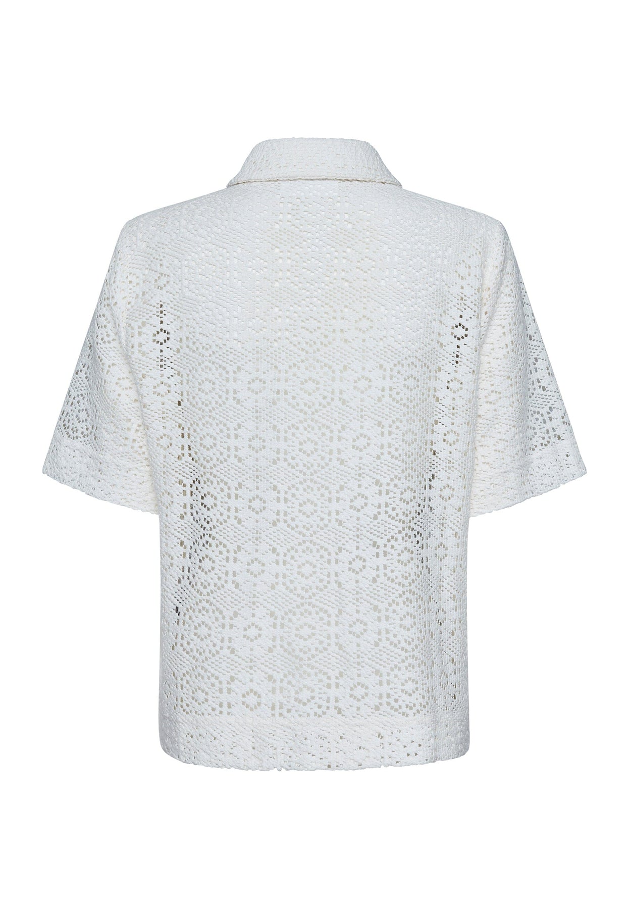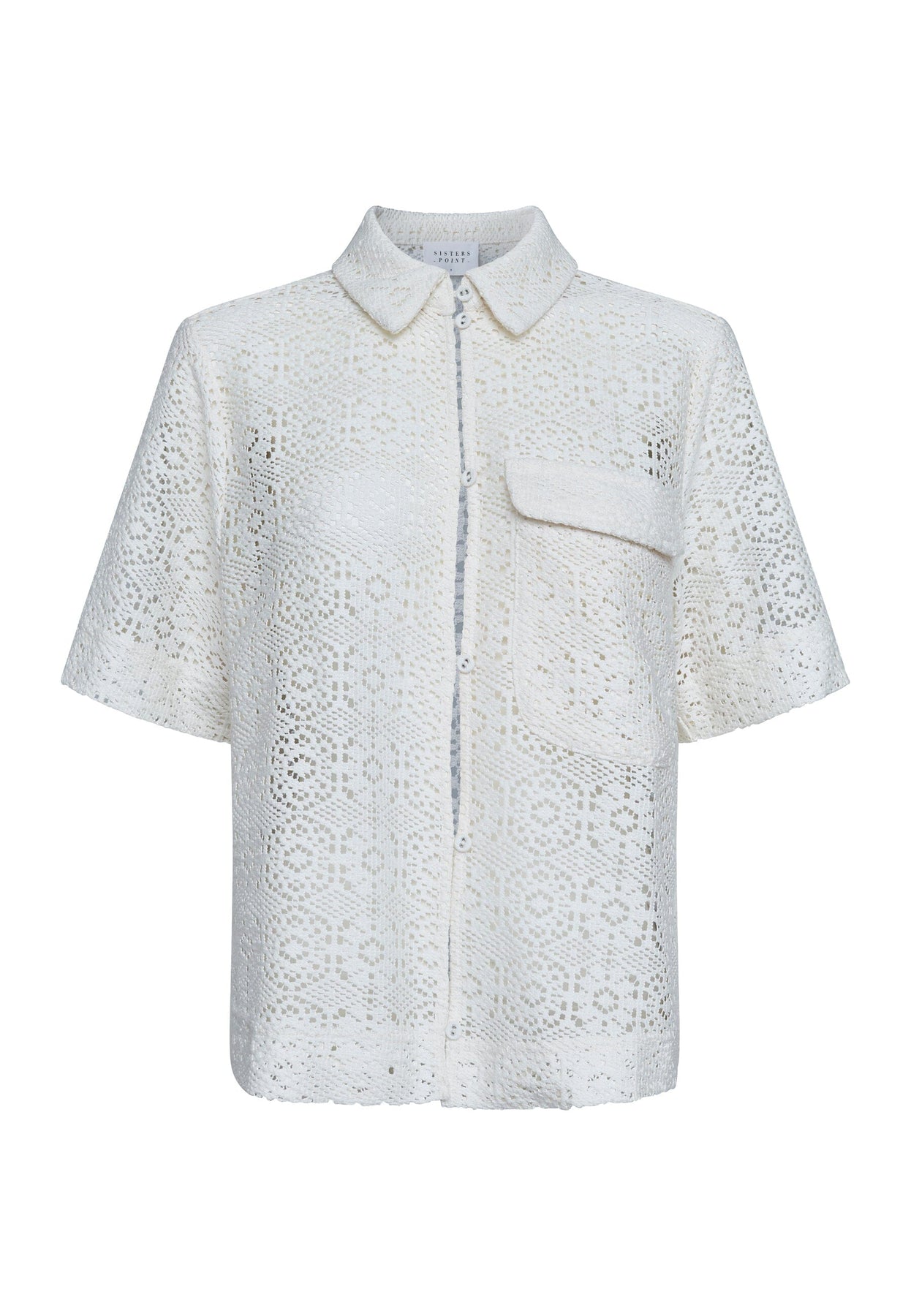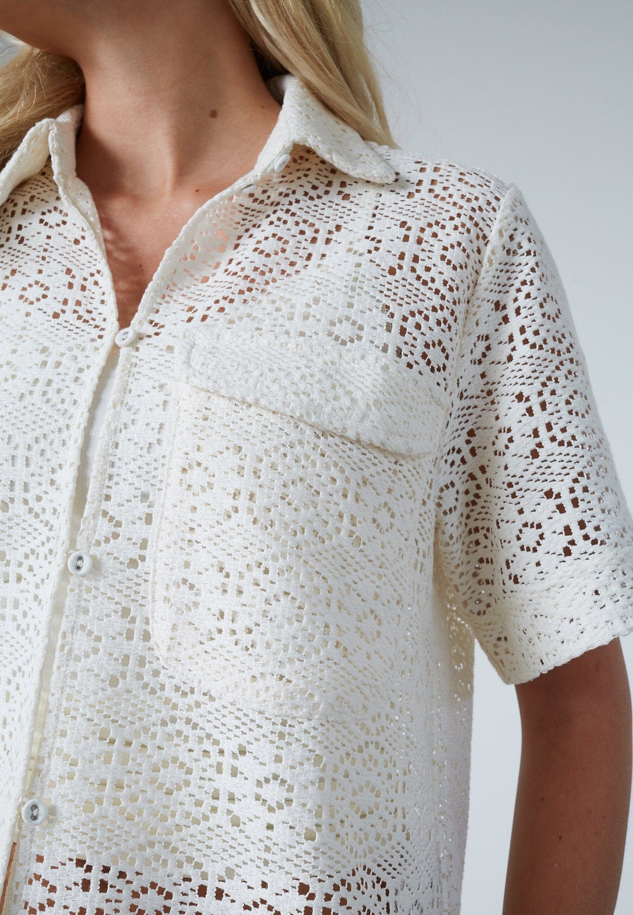 Cremefarbene Bluse von Sisters Point mit Spitzenmuster im Burnout-Stil. Die Bluse hat einen klassischen Kragen, kurze Ärmel und Knöpfe bis zur Mitte.