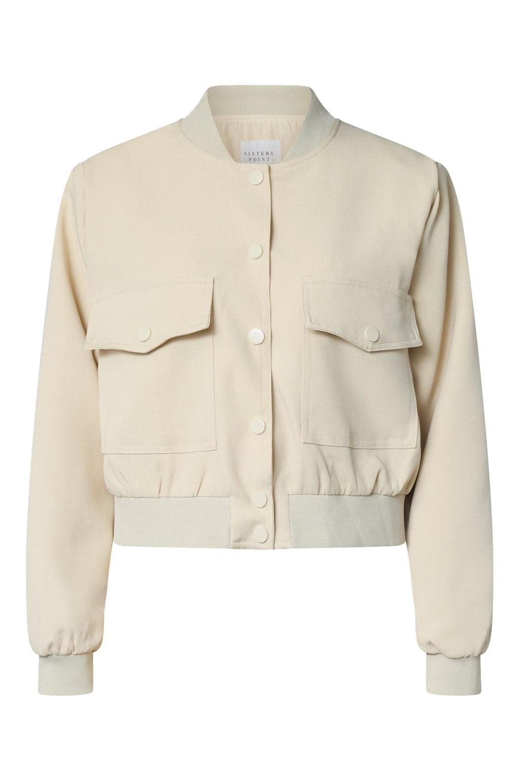 Kurze Jacke von Sisters Point in einem hellbeigen Farbton. Die Jacke hat einen runden Halsausschnitt mit Gummizug und lange Ärmel mit breiten Rippstrickbündchen.