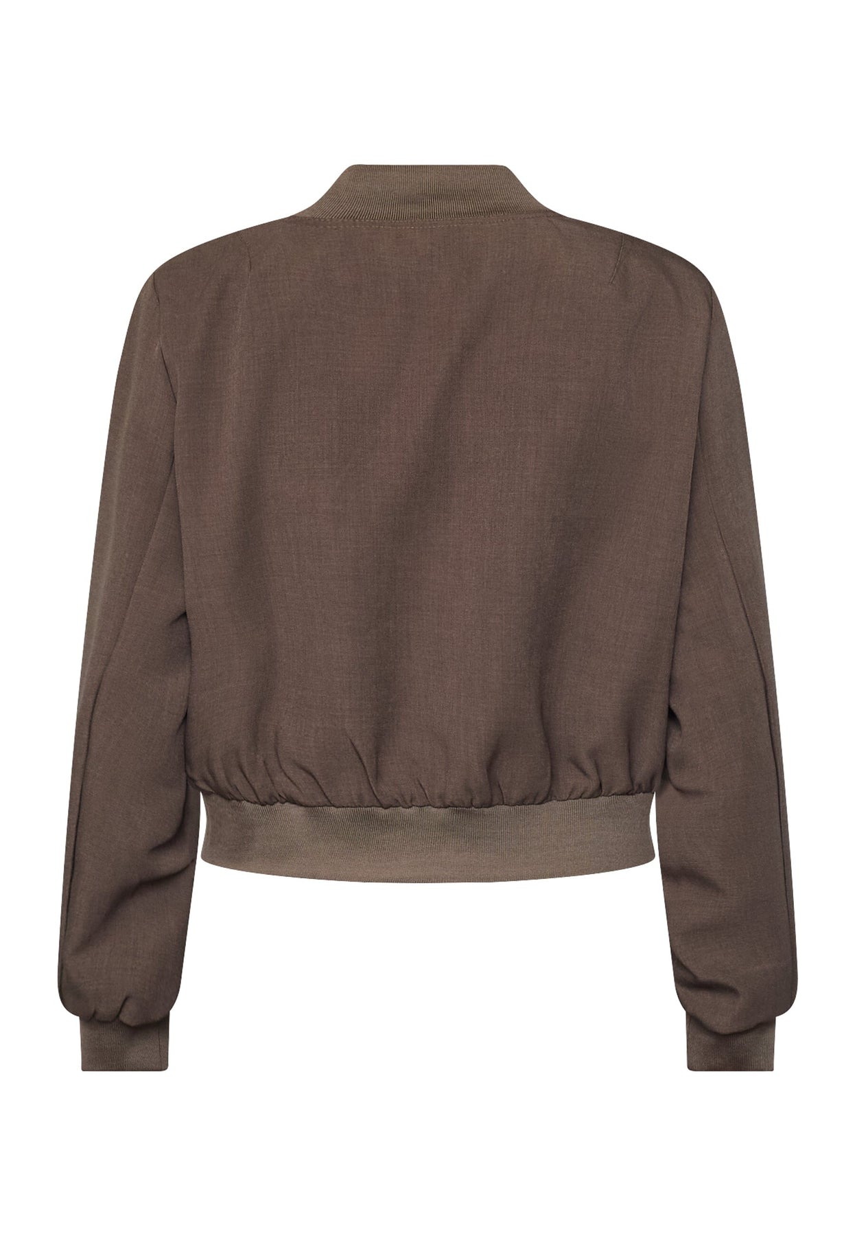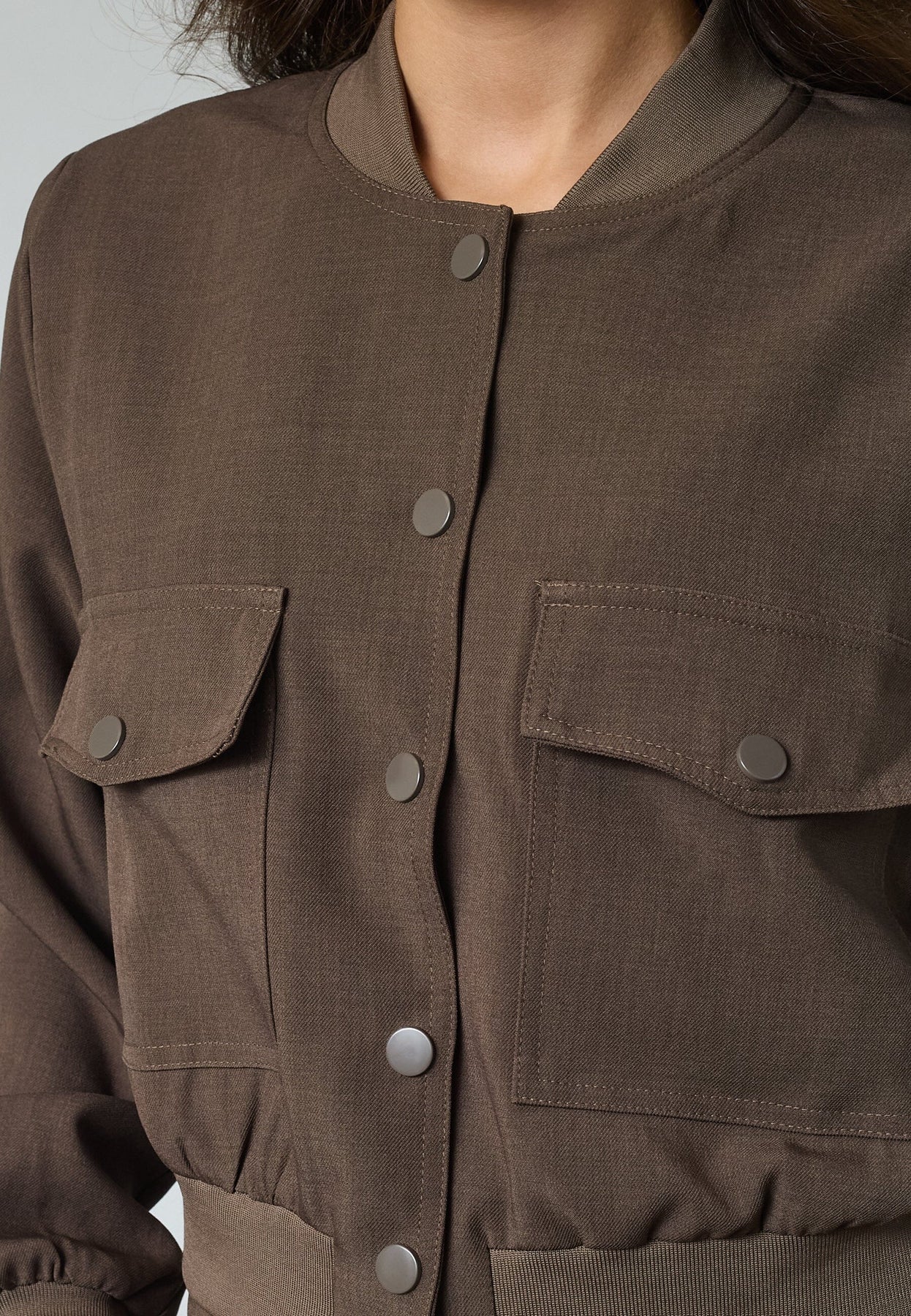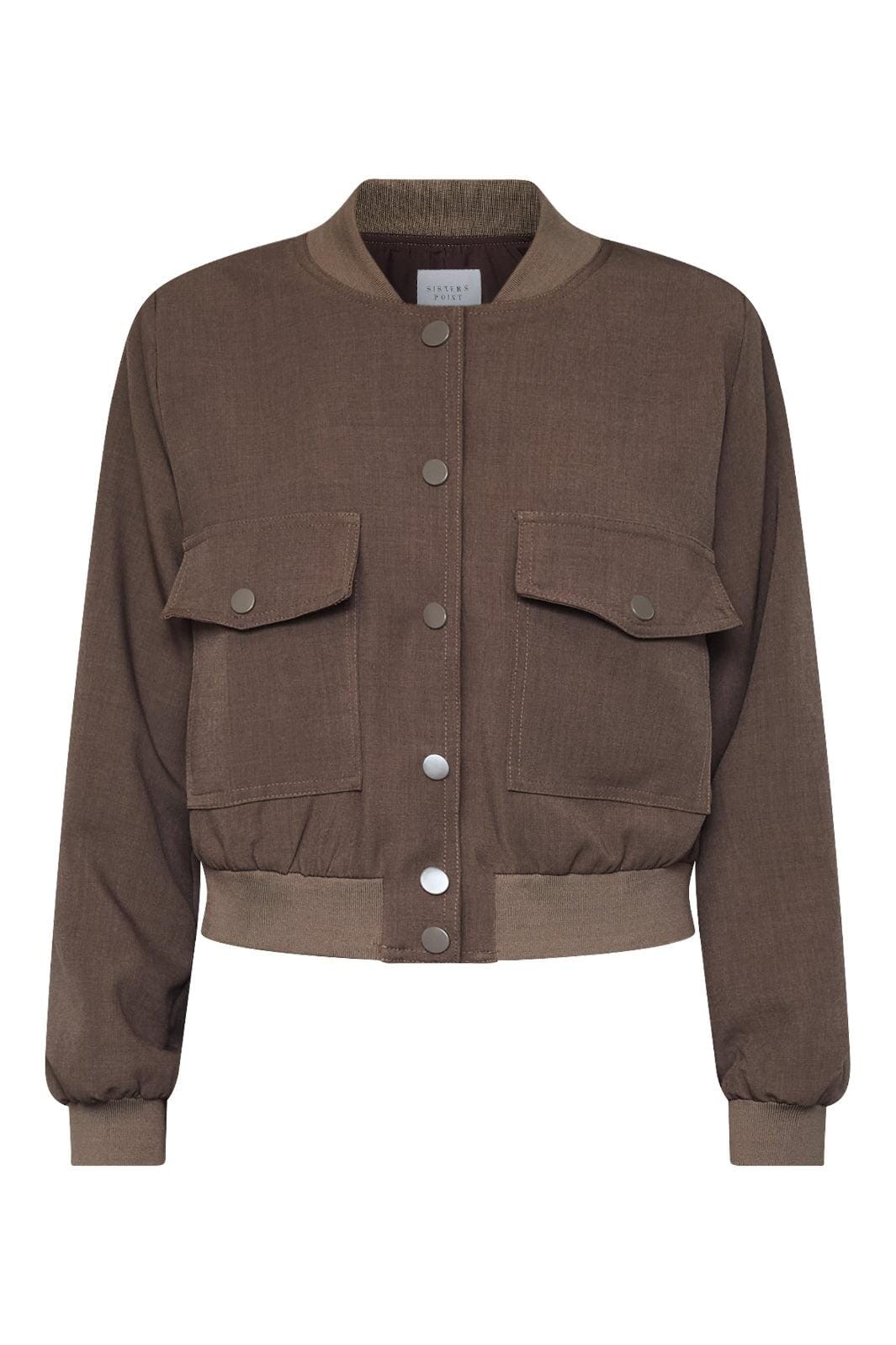 Kurze Jacke von Sisters Point in einem Braunton. Die Jacke hat dekorative Nähte, Druckknöpfe entlang der Mitte und zwei Brusttaschen mit Klappen.