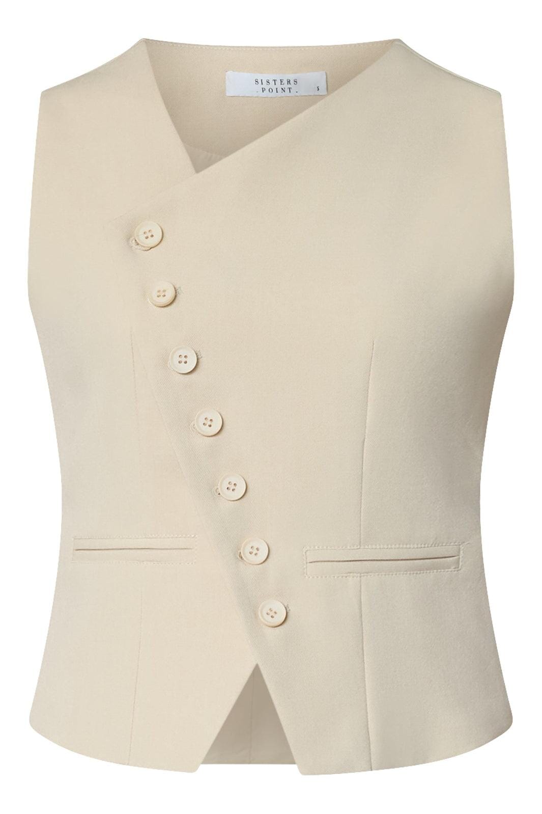 Ärmlose Weste von Sisters Point in einem hellbeigen Farbton. Die Weste hat einen V-Ausschnitt und dekorative Knöpfe entlang der Vorderseite.