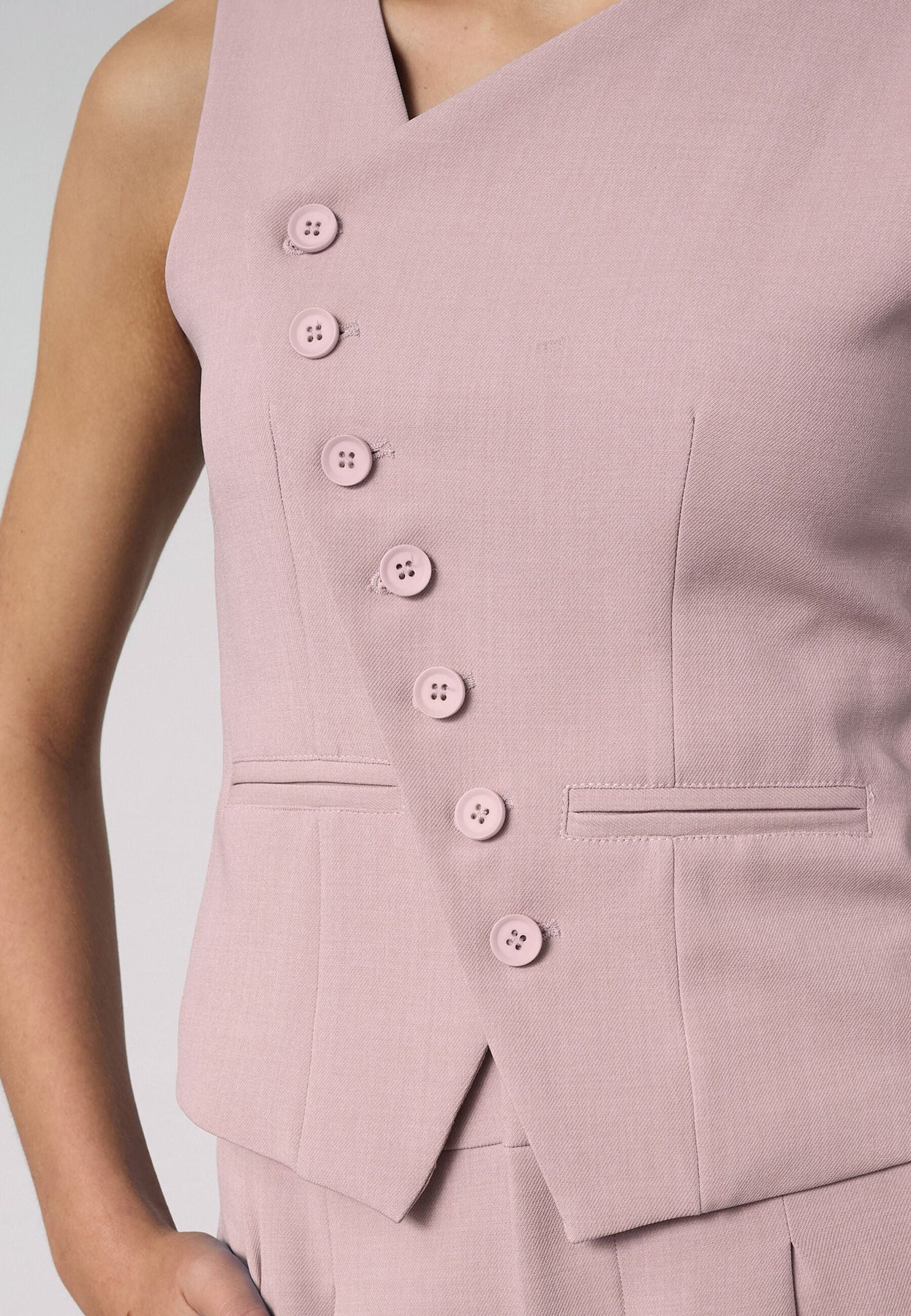 Lila Weste von Sisters Point, gefertigt aus 92 % Polyester und 8 % Elasthan. Die Weste hat ein asymmetrisches Design mit sieben Knöpfen entlang der Vorderseite.
