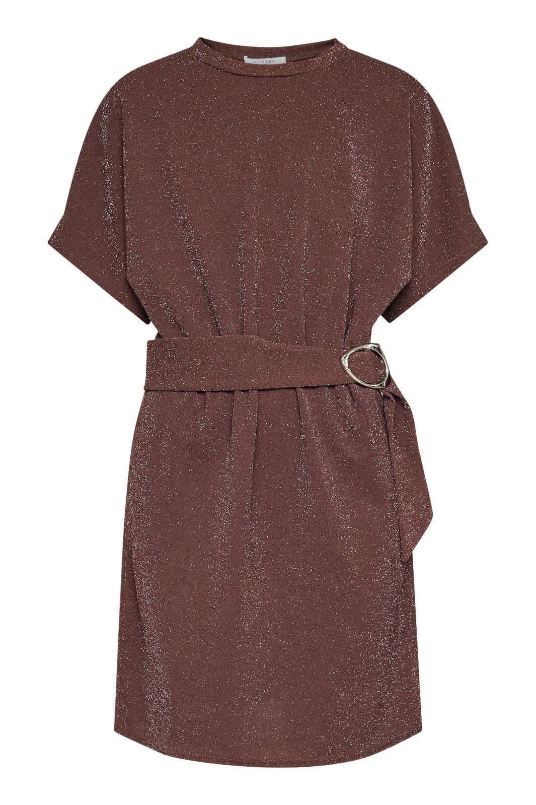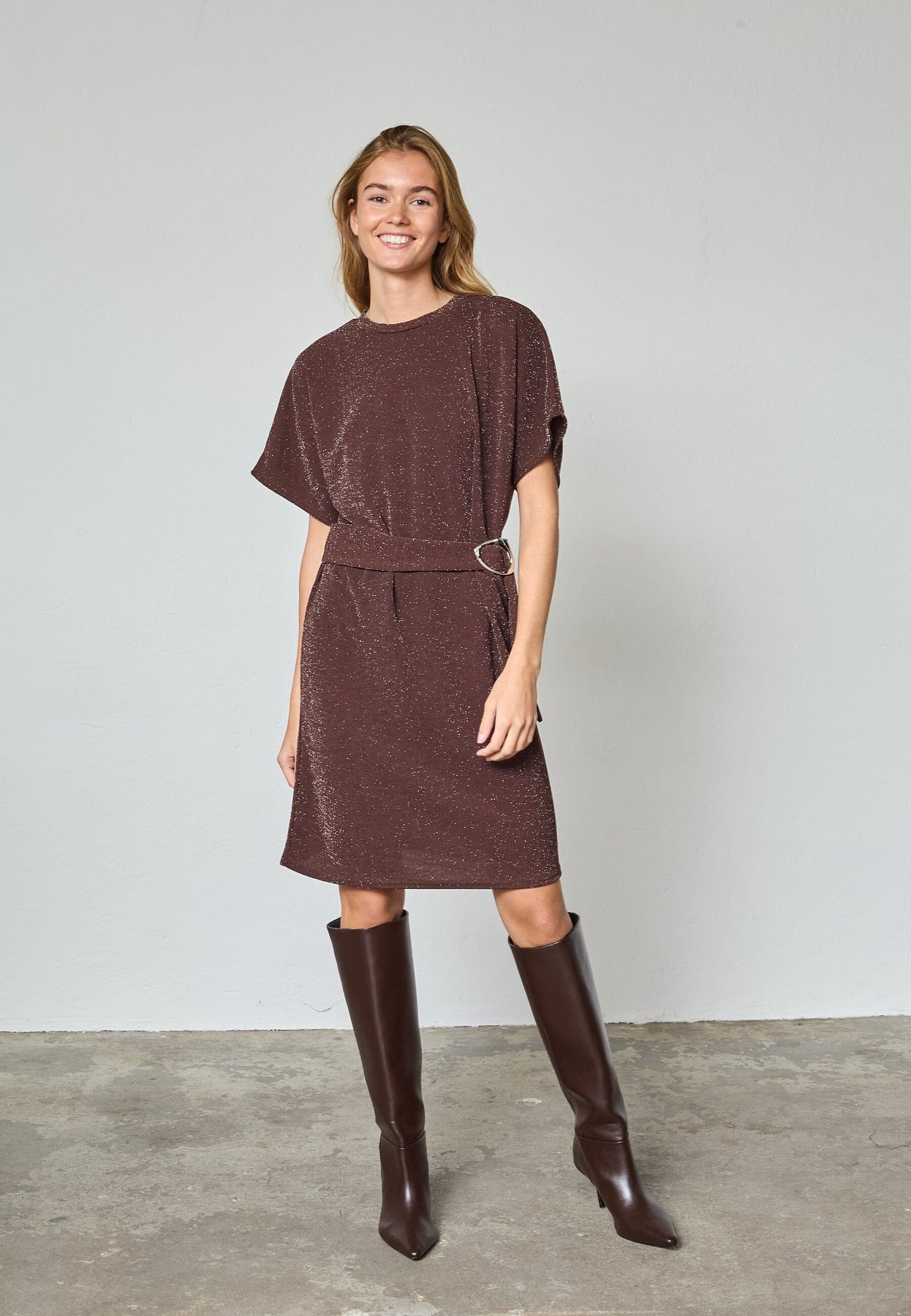 Braunes Kleid von Sisters Point mit einer strukturierten Oberfläche, bei der glänzende silberfarbene Fäden dem Kleid einen festlichen Ausdruck verleihen.
