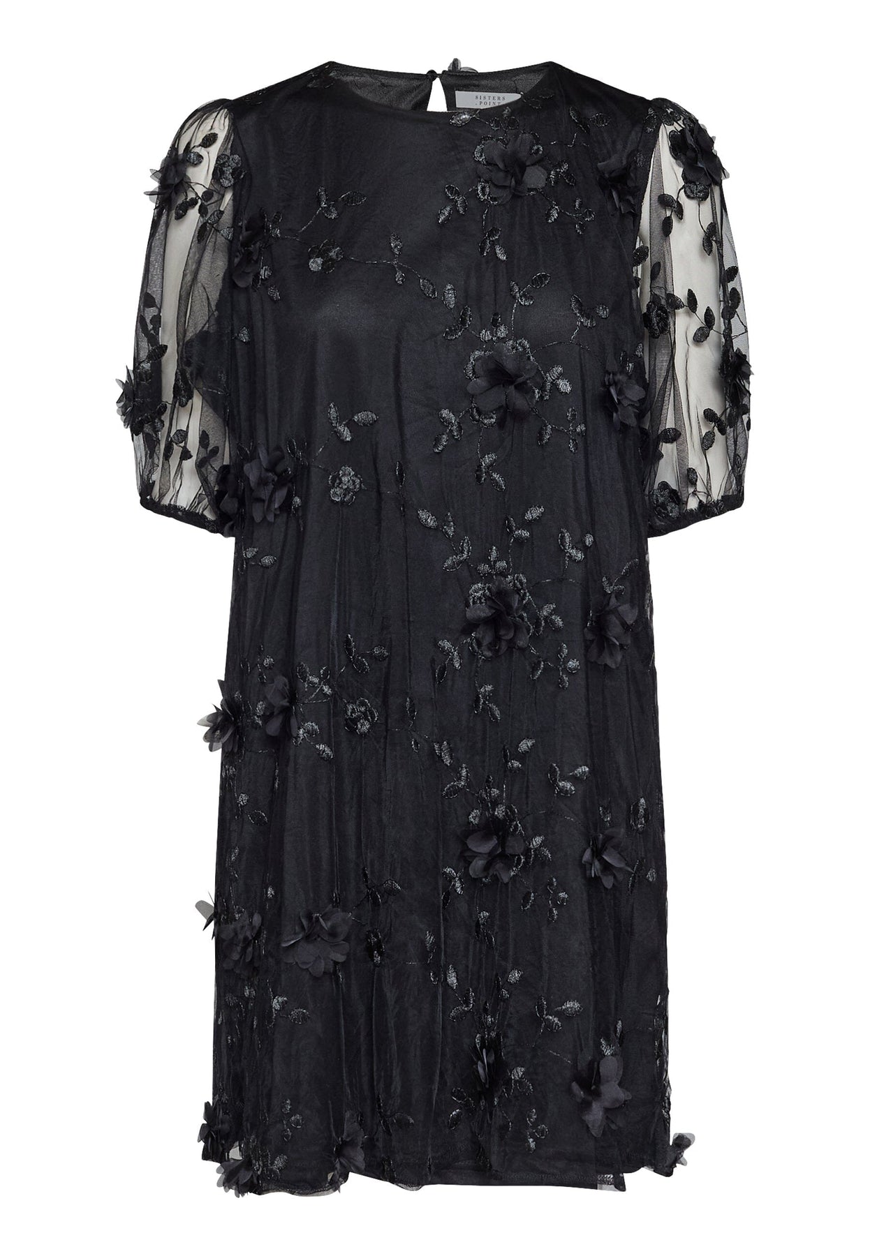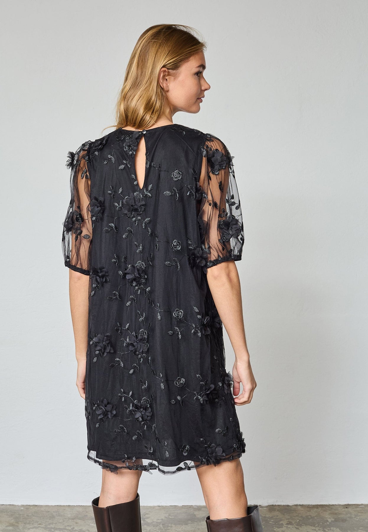 Schwarzes Kleid von Sisters Point. Das Kleid besteht aus einem leichten, transparenten Material und eignet sich sowohl für festliche als auch für formelle Anlässe.