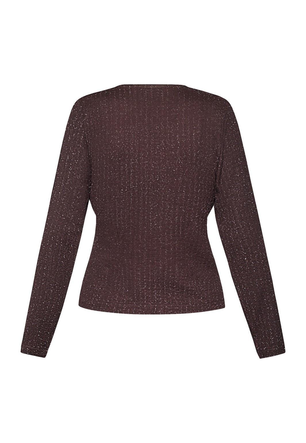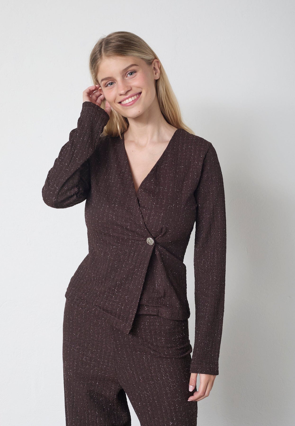 Braune Bluse von Sisters Point mit silberglänzenden Details. Die Bluse hat lange Ärmel, einen V-Ausschnitt und ein asymmetrisches Design mit Knopfverschluss.