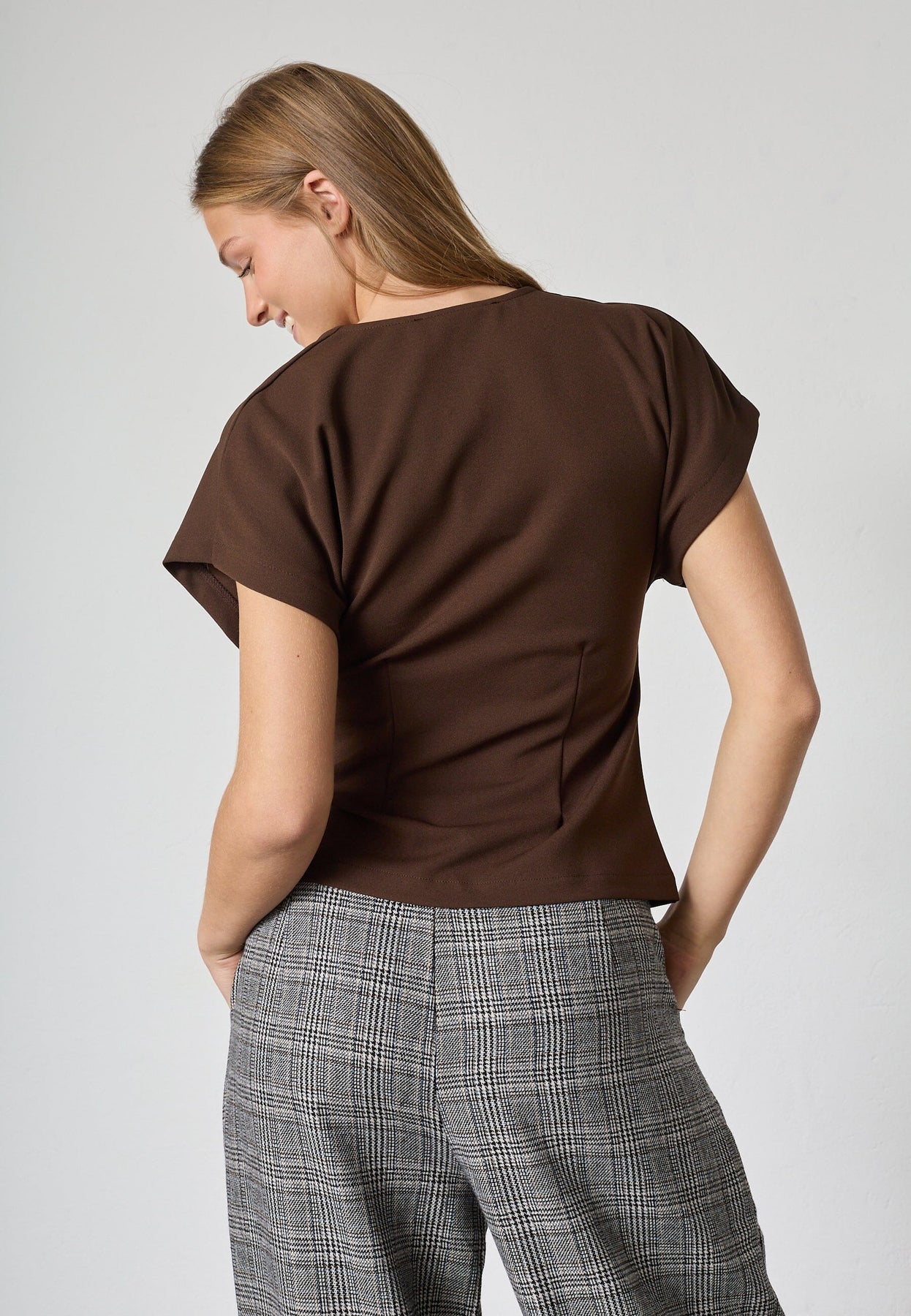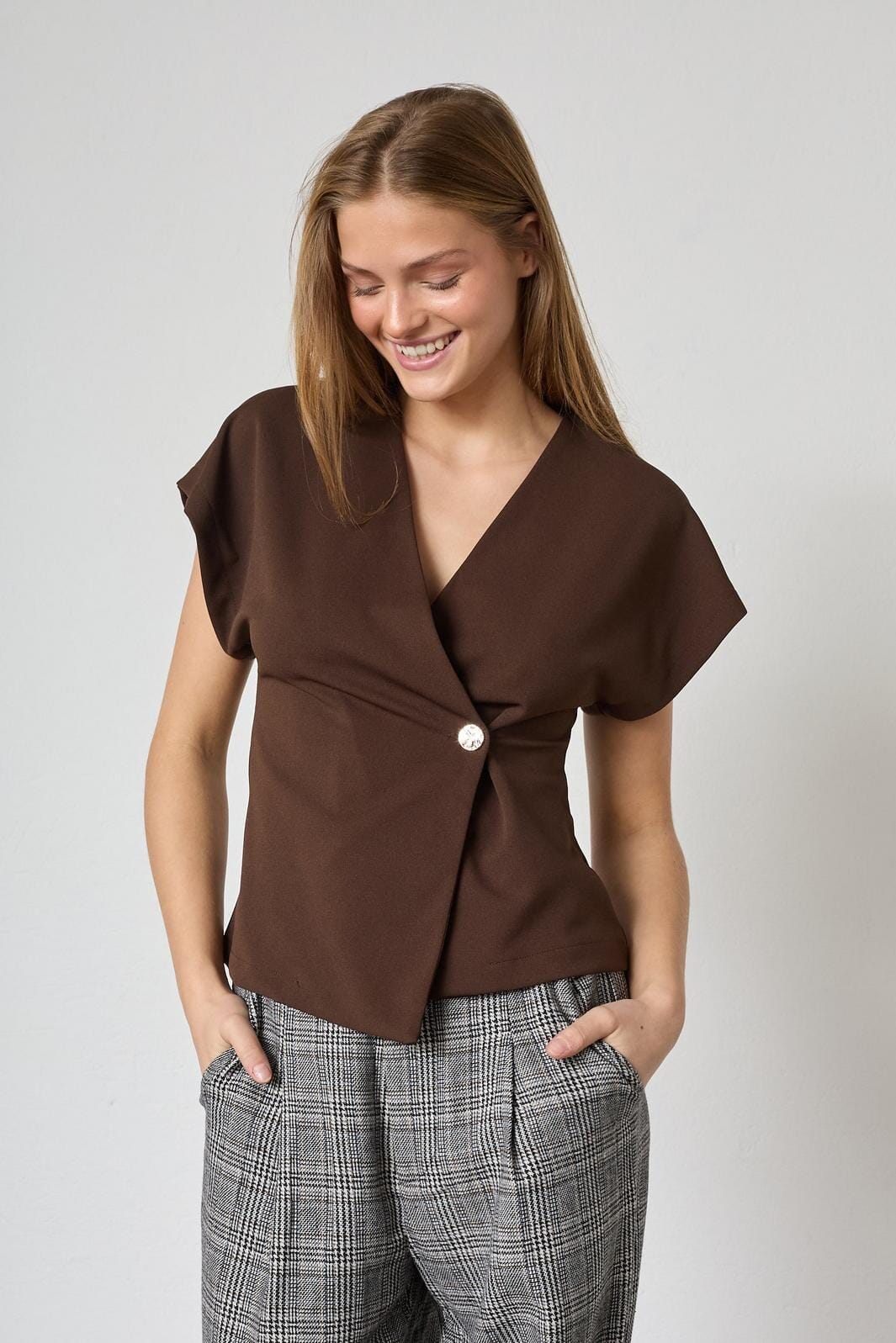 Dunkelbrauner Top von Sisters Point mit Wickeldesign und kurzen Ärmeln. Der Top hat einen tiefen V-Ausschnitt und einen dekorativen goldenen Knopf an der Seite.