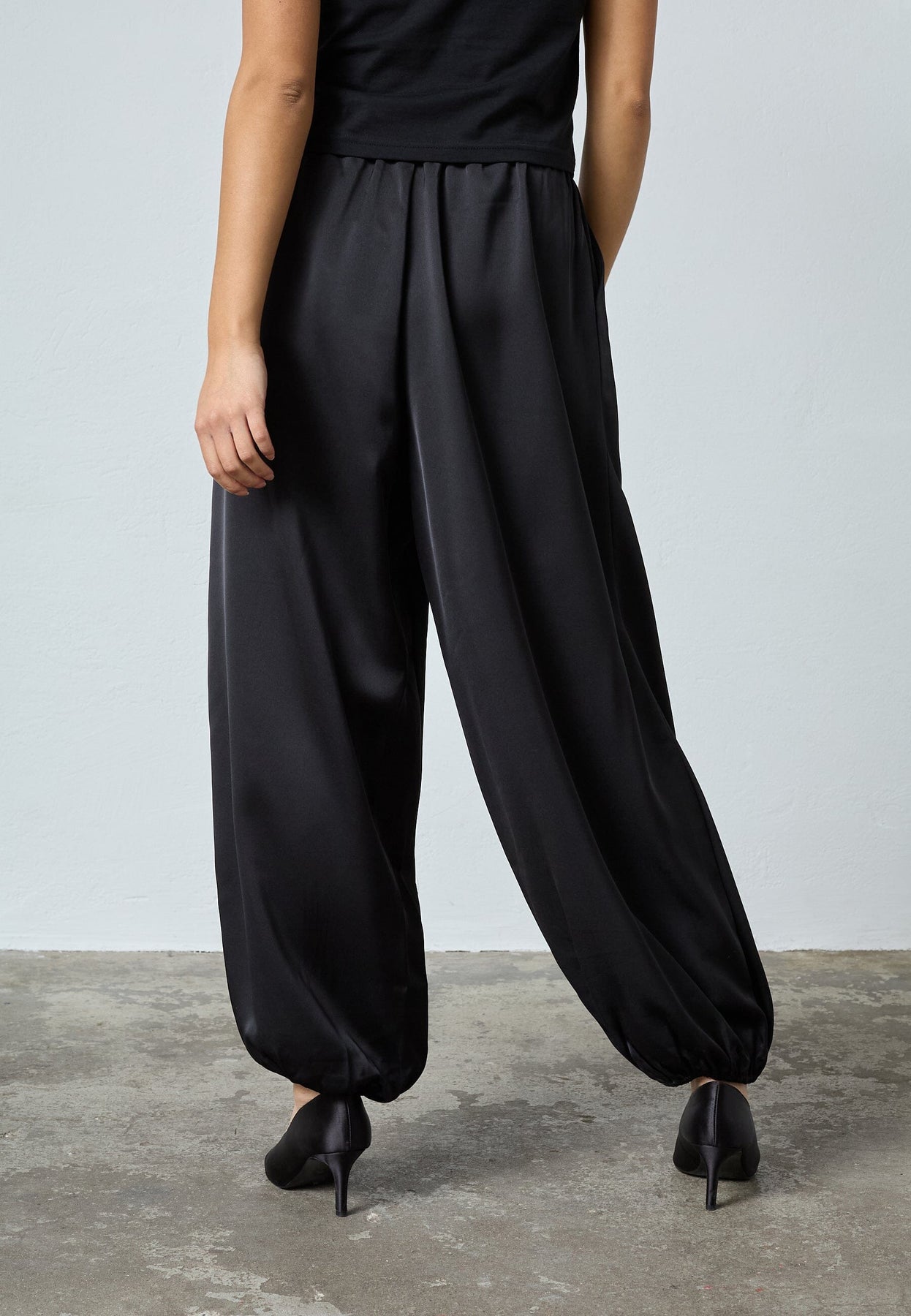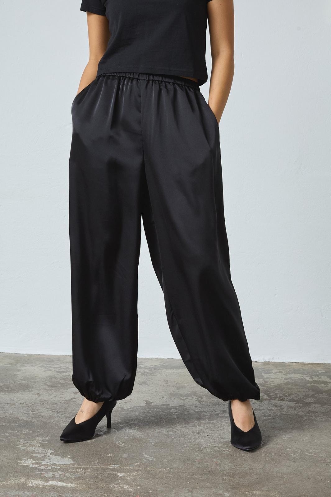 Schwarze Hose von Sisters Point, aus 100 % Polyester mit einer glatten, glänzenden Oberfläche. Die Hose hat eine lockere Passform und einen elastischen Bund.