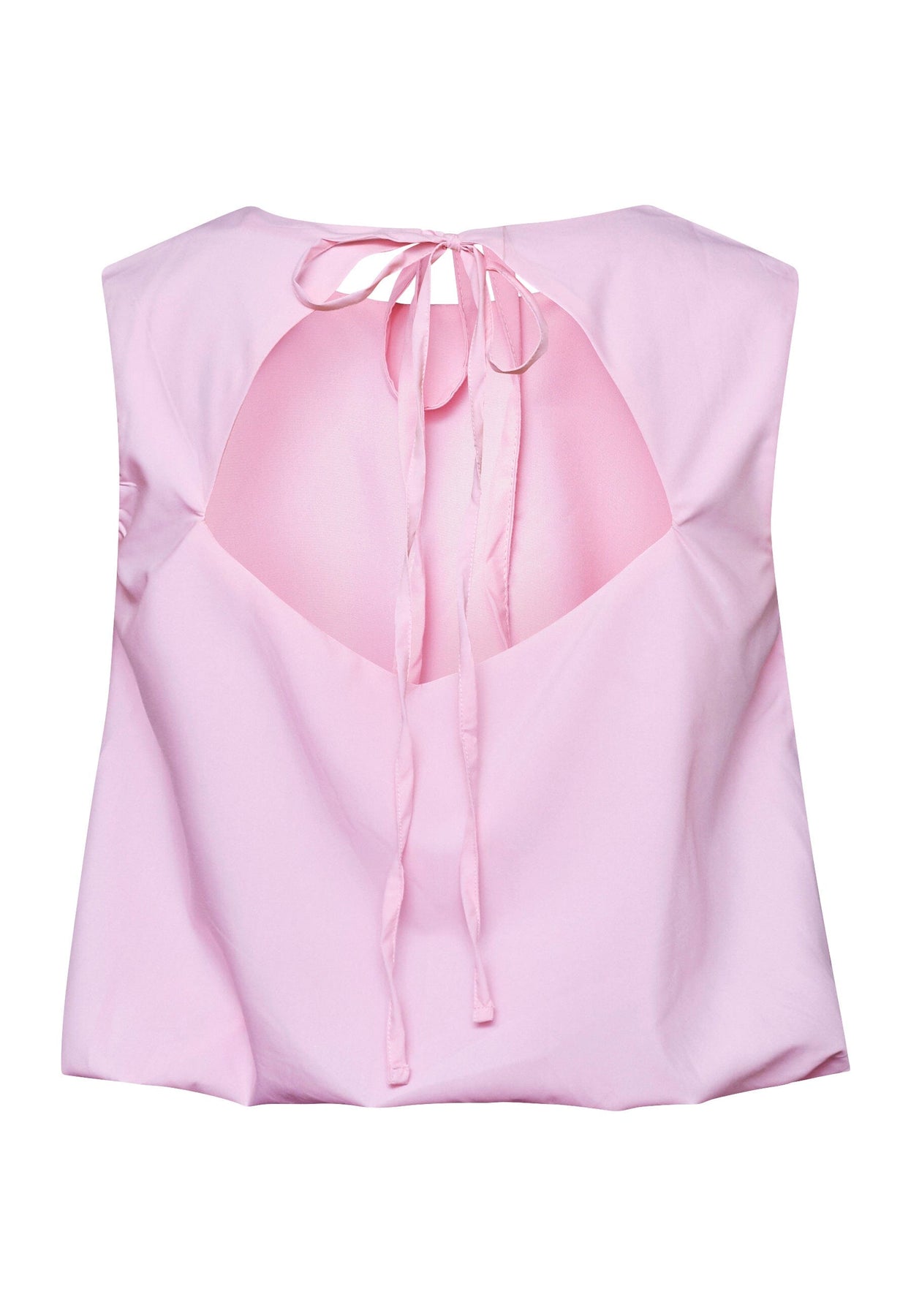 Baby rosa Top von Sisters Point mit Rundhalsausschnitt. Der Top hat eine lockere Silhouette und ein Ausschnittdesign auf der Rückseite mit dekorativen Bändern, die ihm eine feminine Note verleihen.