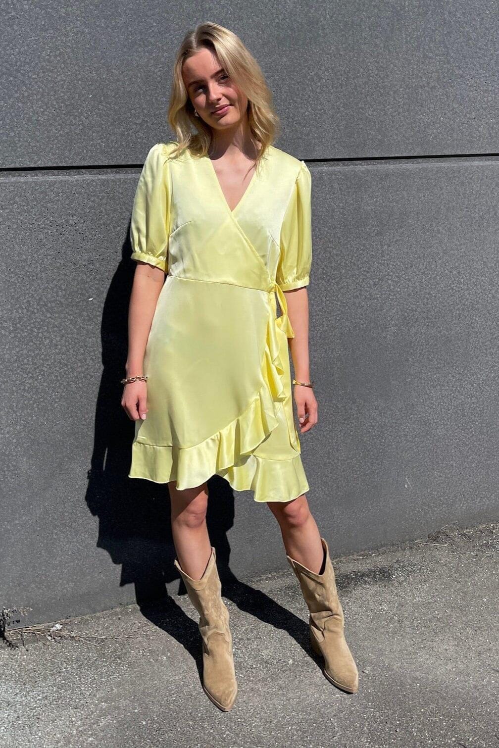 Wickelkleid von Sisters Point aus hellgelbem Satin. Das Kleid hat Puffärmel, einen V-Ausschnitt und einen Volant am Saum. Ein Bindeband an der Seite schafft eine schöne Silhouette.