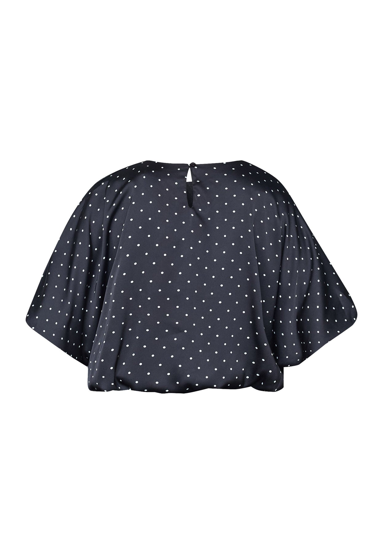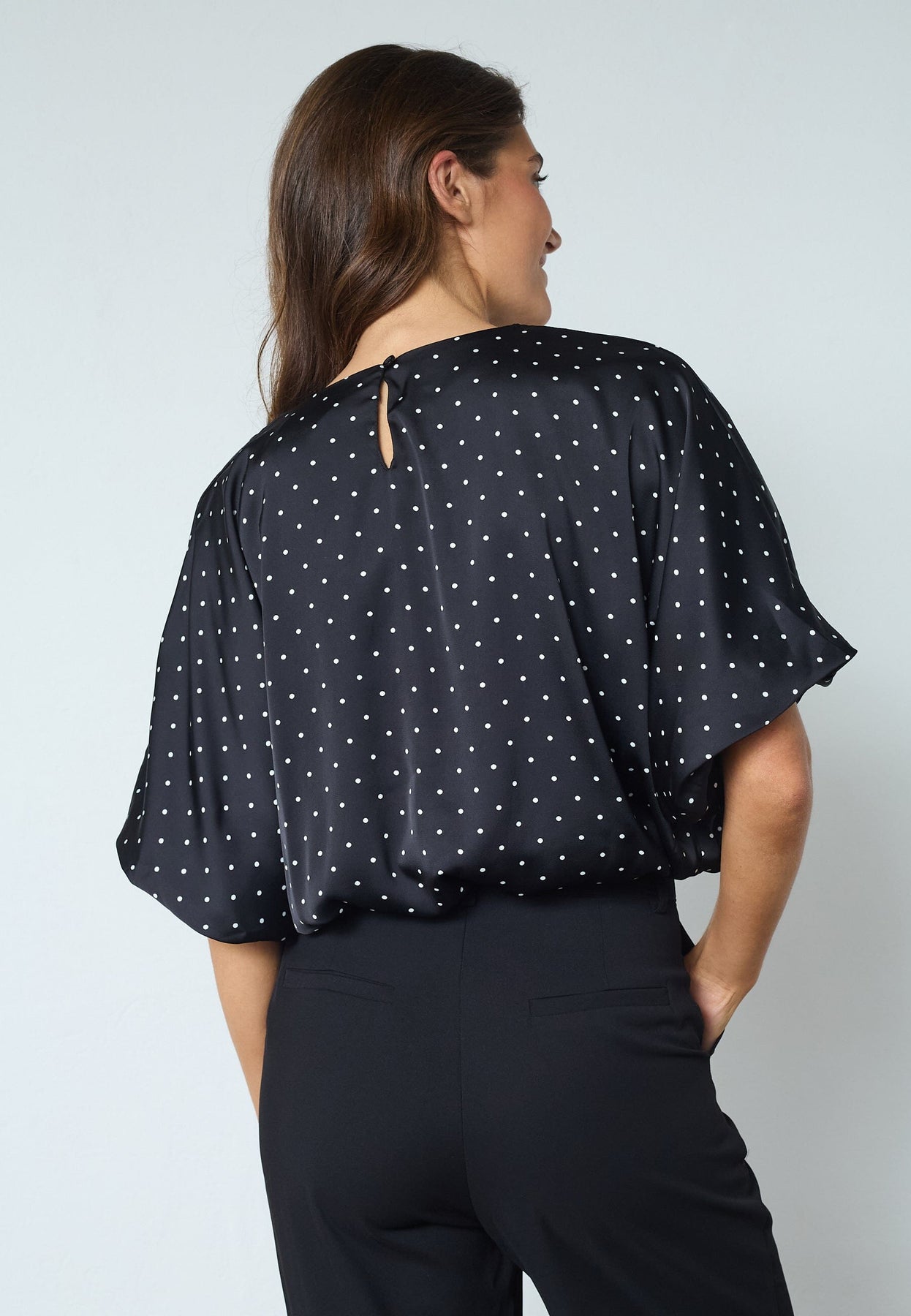 Schwarzes Top von Sisters Point mit weißen Punkten. Das Top hat eine lockere Passform und kurze Ärmel.