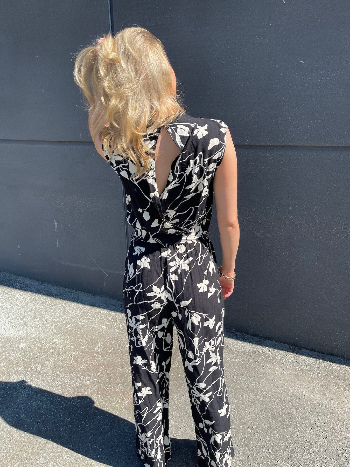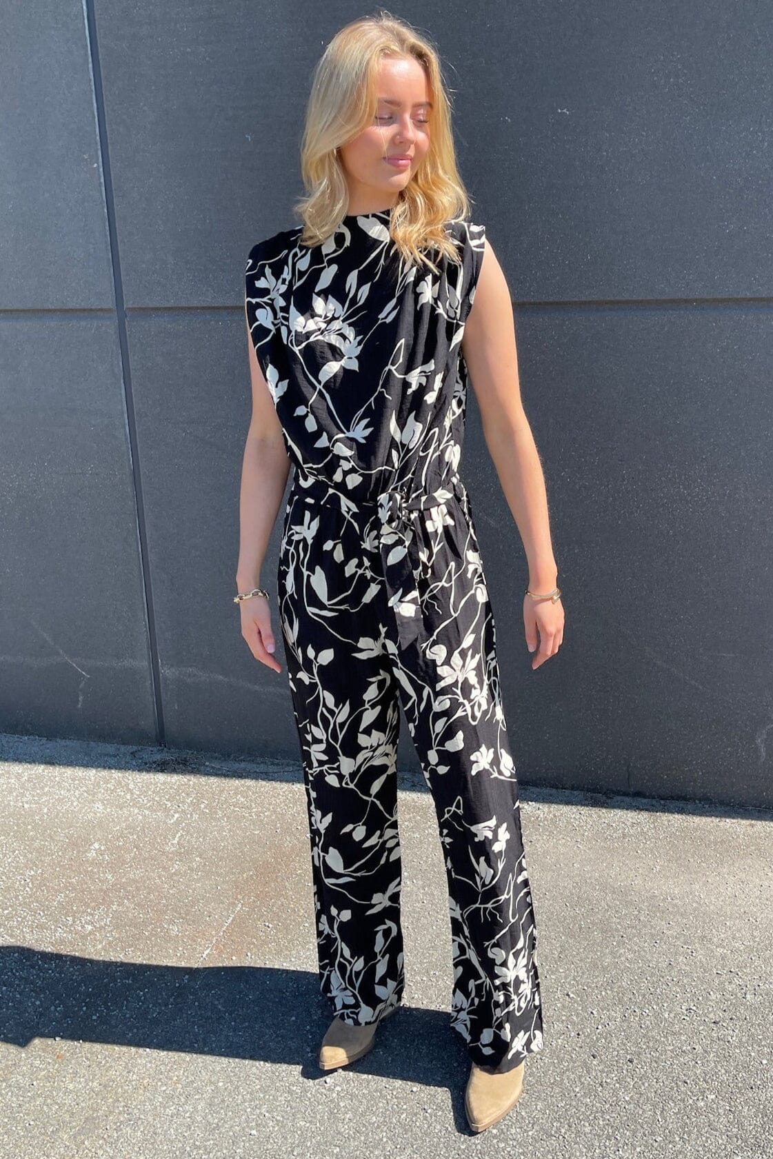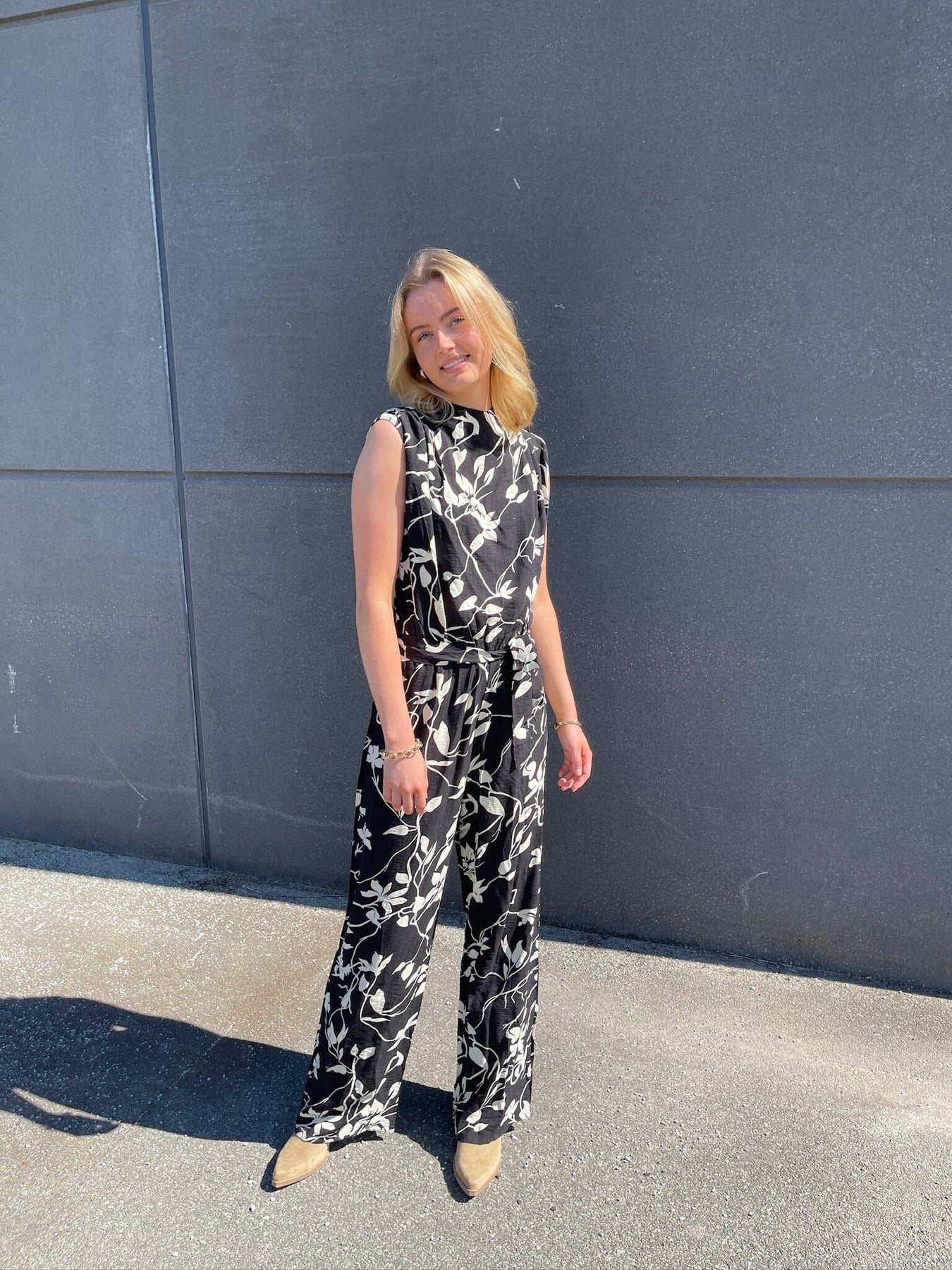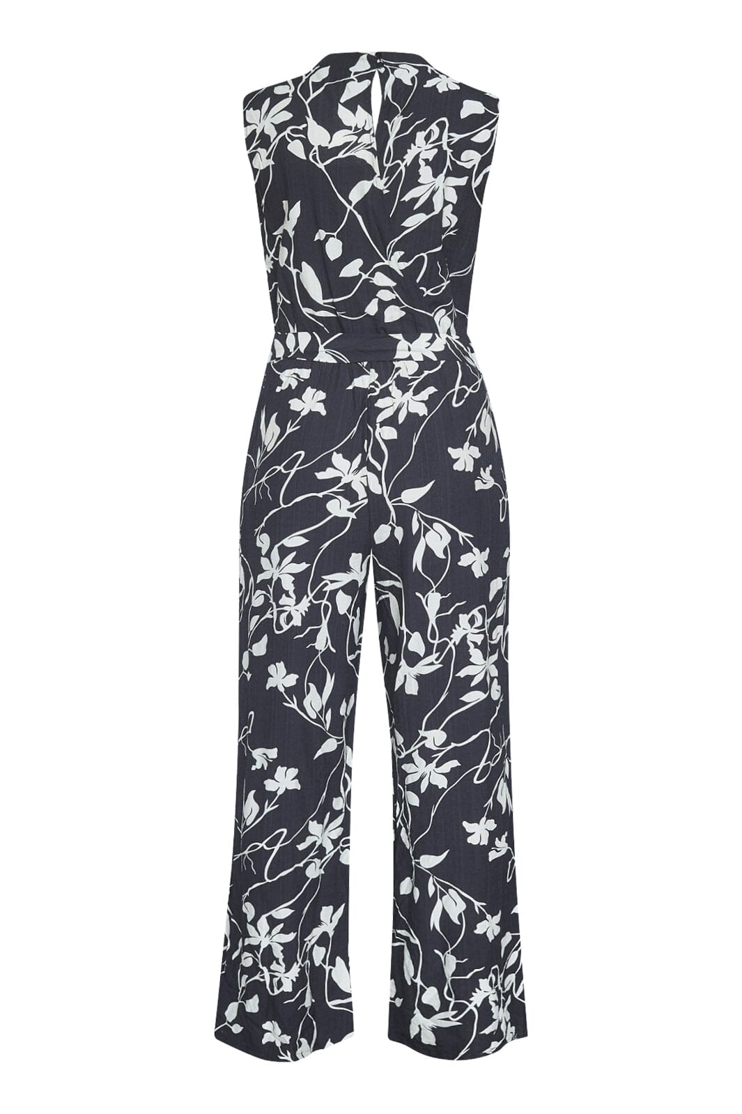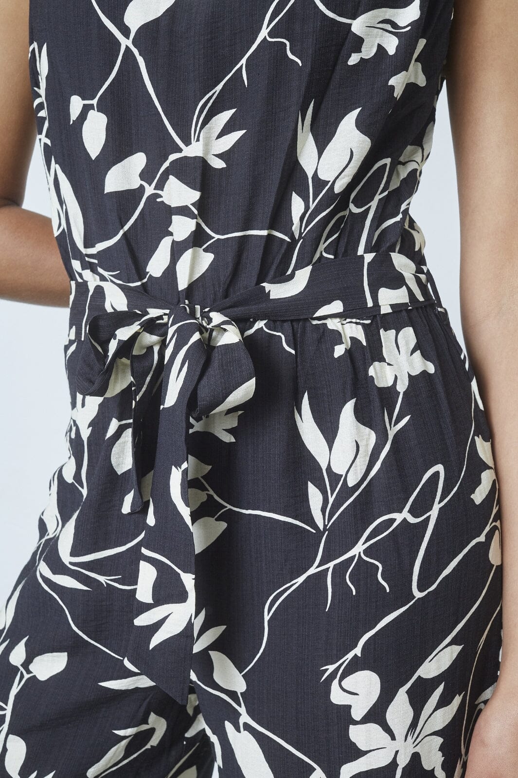 Schwarzer Jumpsuit von Sisters Point mit weißem Blumenmuster. Das ärmellose Modell hat einen hohen Kragen und ein Bindeband in der Taille. Das Design hat eine Knöchellänge und eine lockere Passform.