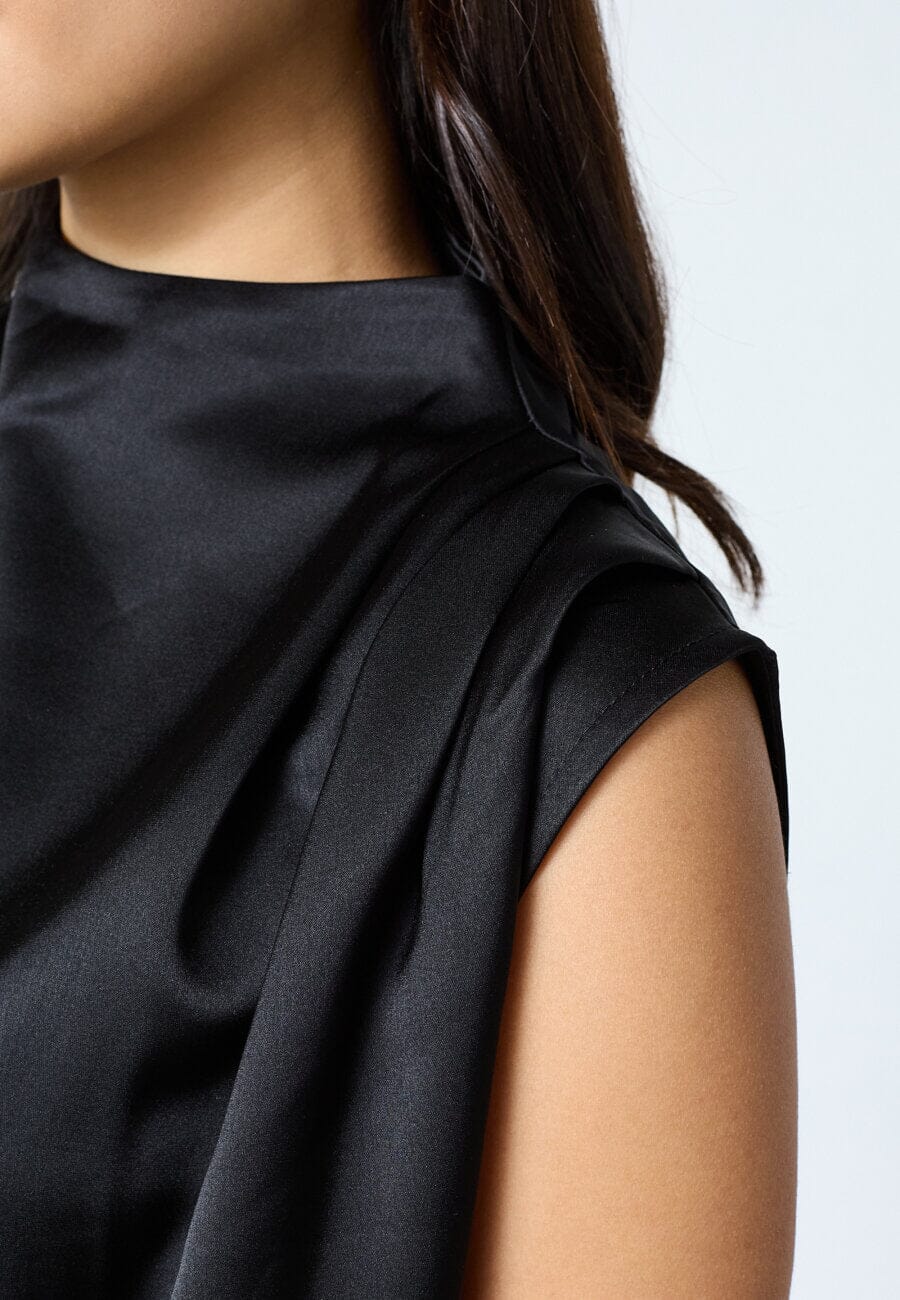 Schwarze ärmellose Bluse von Sisters Point mit glänzender Satinoptik. Das Material besteht aus 100% Polyester mit einer glatten Oberfläche.