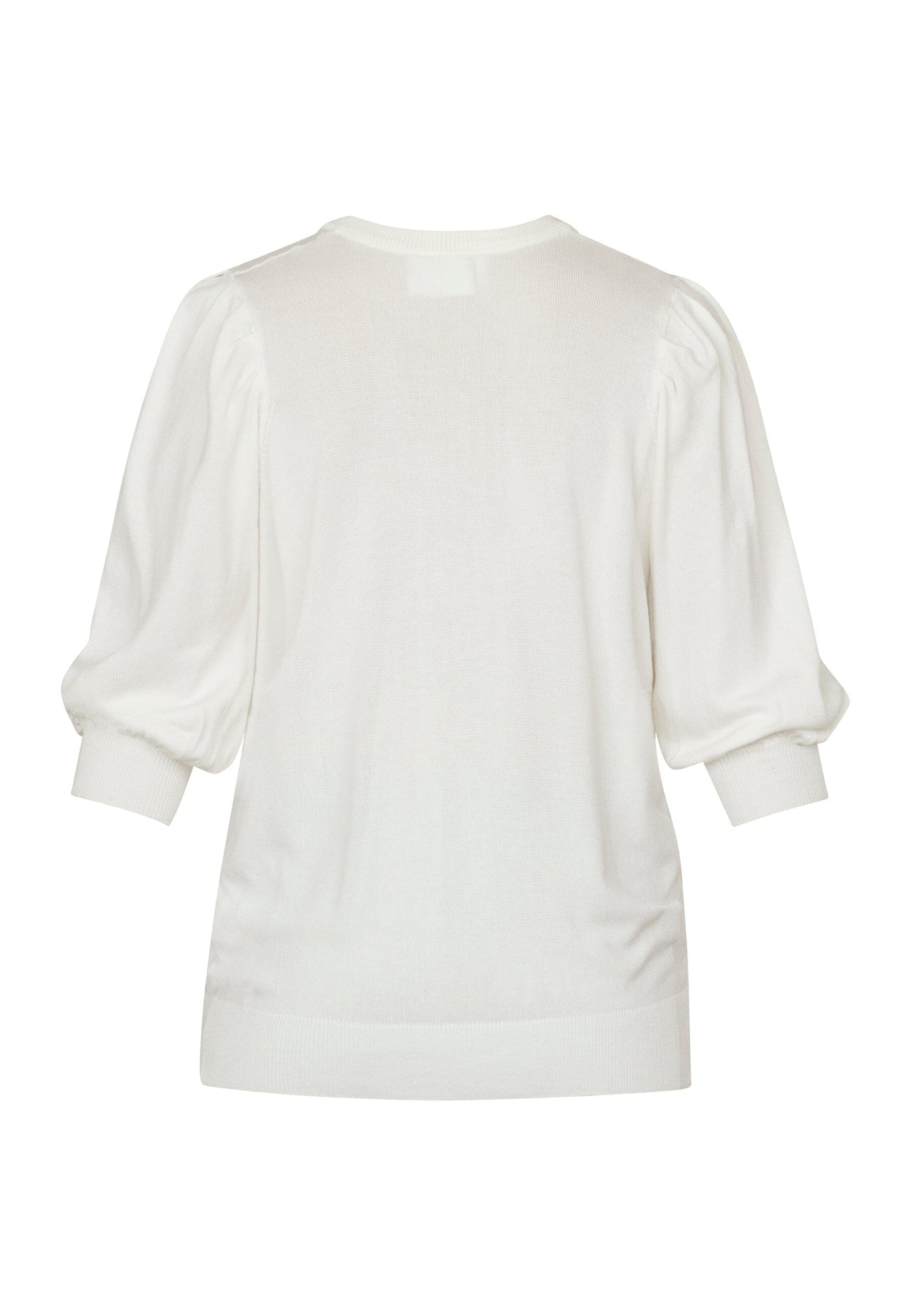 Feinstrick-Cardigan in cremefarbener Nuance mit Rundhalsausschnitt und Knopfleiste. Sie hat dreiviertellange Puffärmel und Rippenabschlüsse, die einen weichen und femininen Ausdruck verleihen.