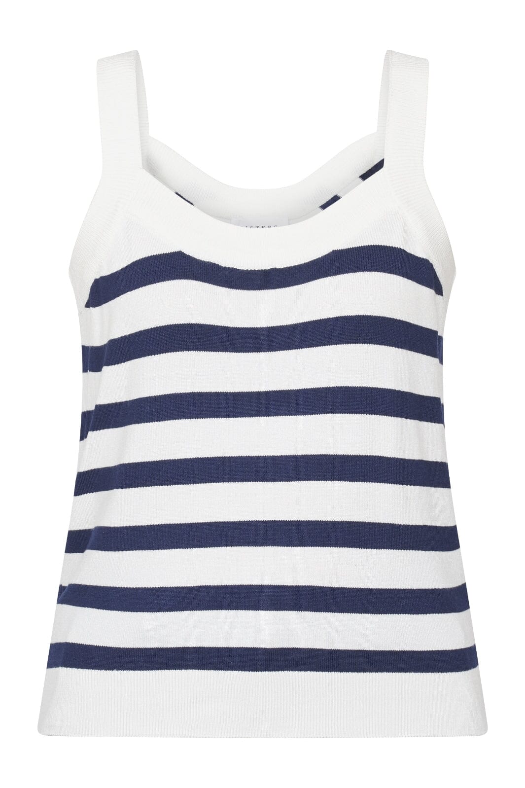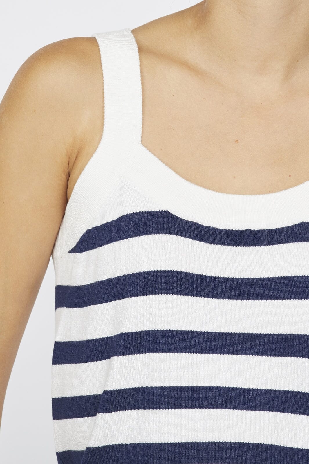 Gestreifter Top von Sisters Point mit breiten Trägern und quadratischem Ausschnitt. Der Top hat ein maritimes Streifenmuster in Creme und Dunkelblau, das einen klaren und einfachen Ausdruck schafft.