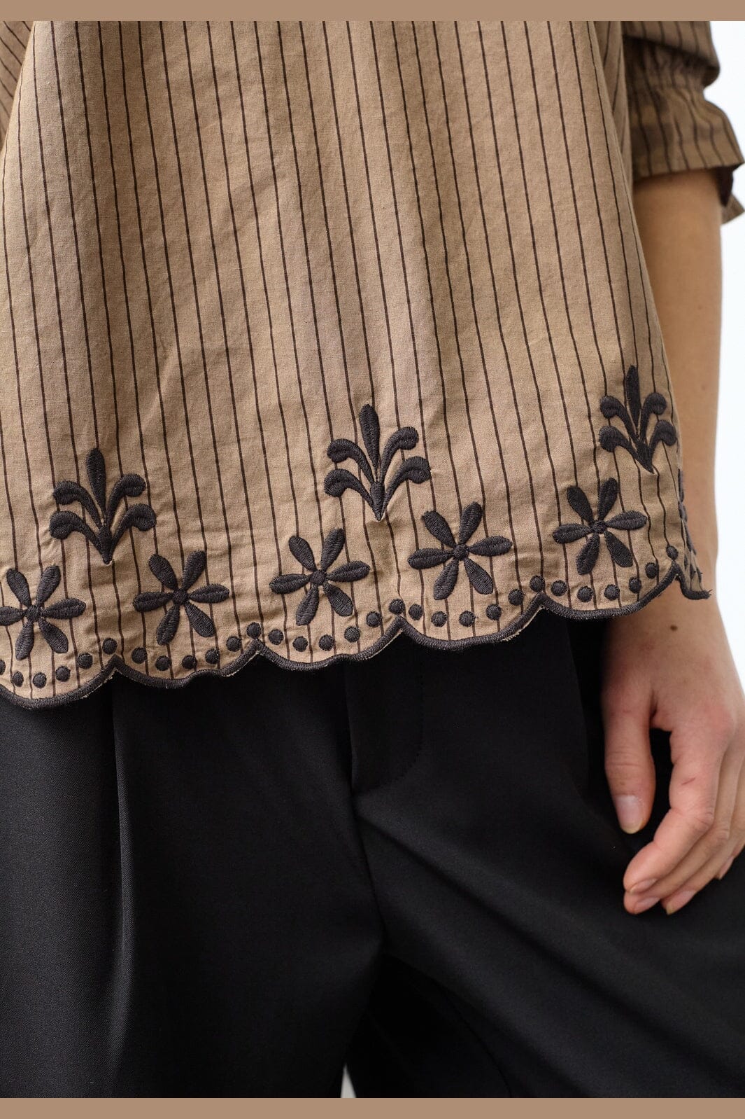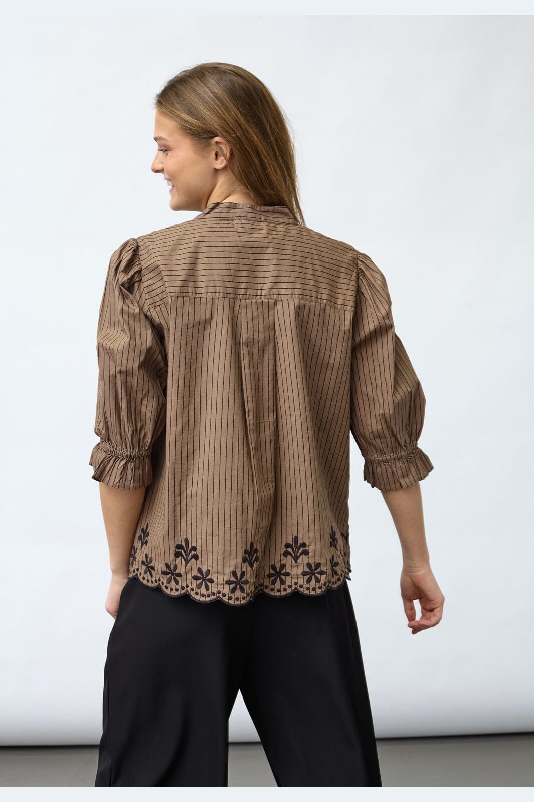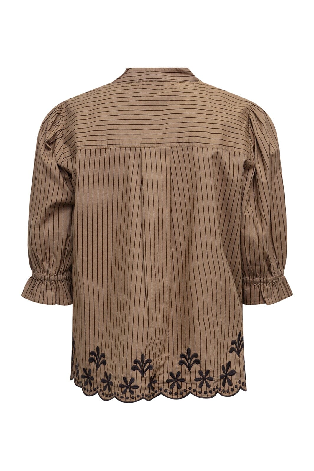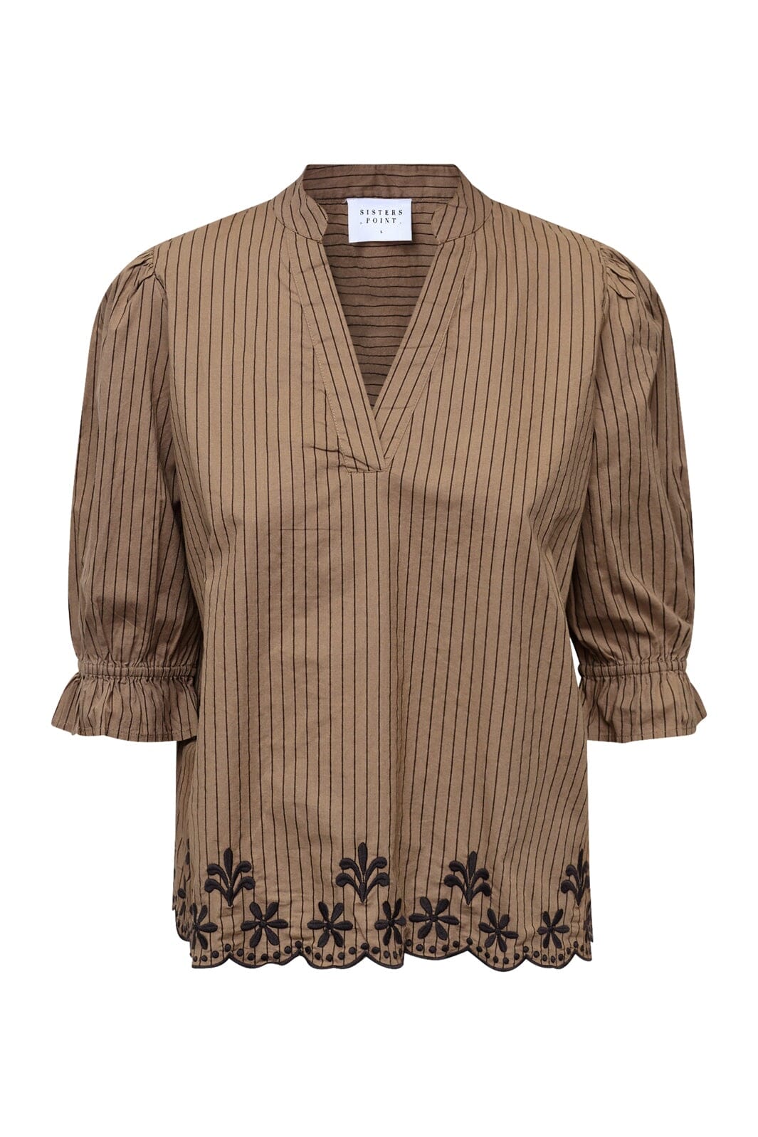 Bluse von Sisters Point mit braun gestreiften vertikalen Linien und einer lockeren Passform. Die Bluse hat Dreiviertelärmel und einen V-Ausschnitt mit kleinem Kragen.