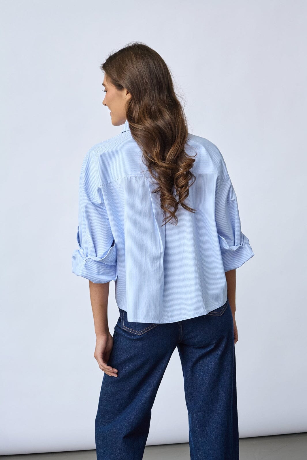 Gestreiftes Hemd von Sisters Point mit blauen und weißen Streifen. Das Hemd hat lange Ärmel, einen Hemdkragen und eine Knopfleiste vorn. Die oversized Passform sorgt für eine lässige Silhouette.