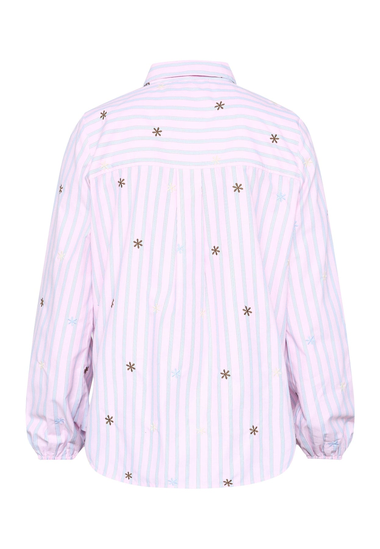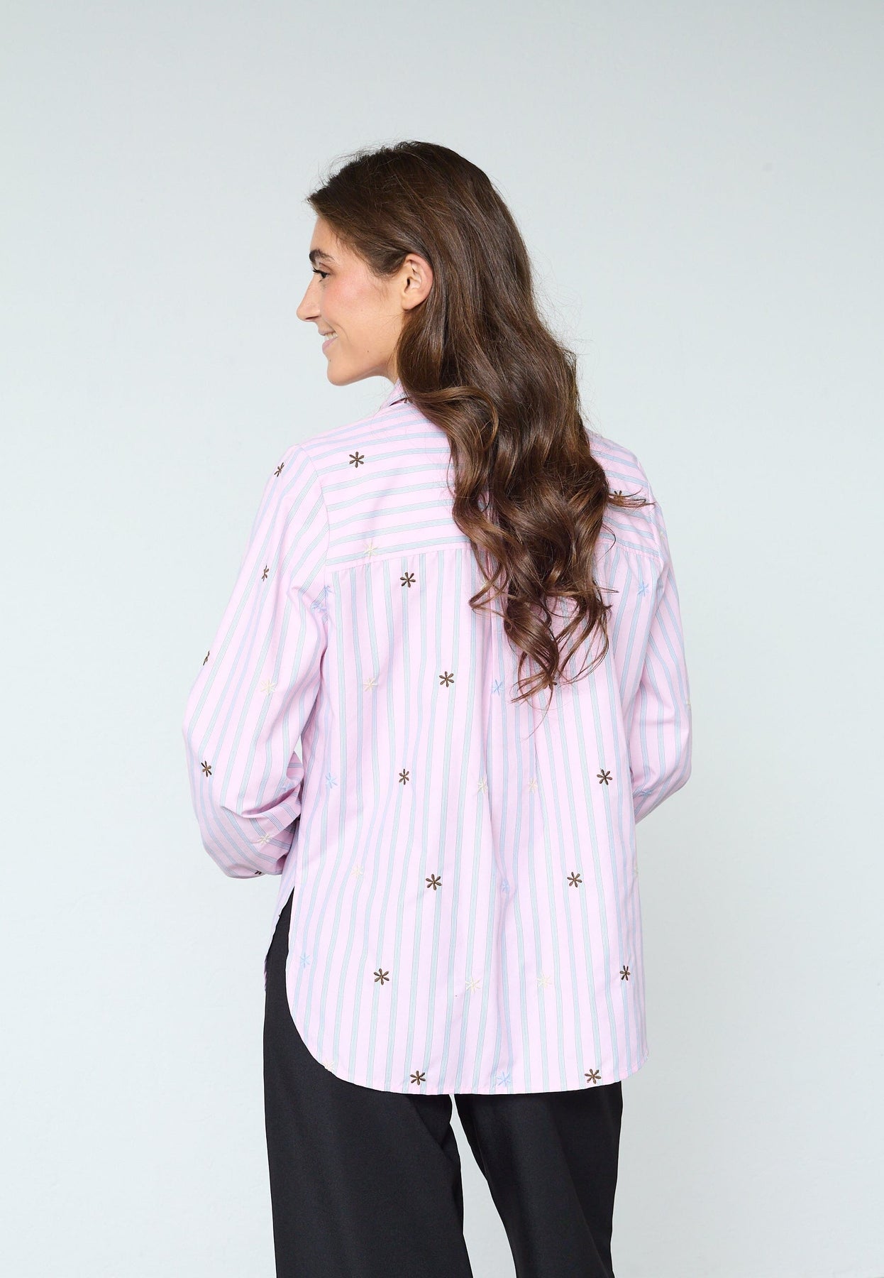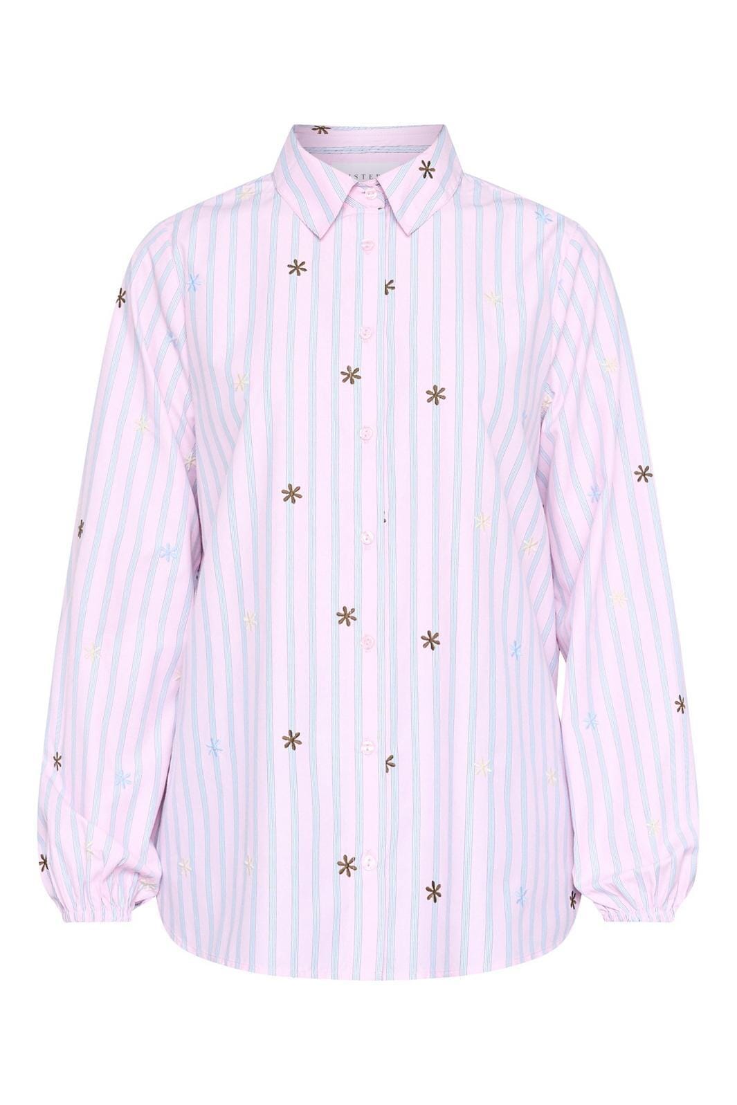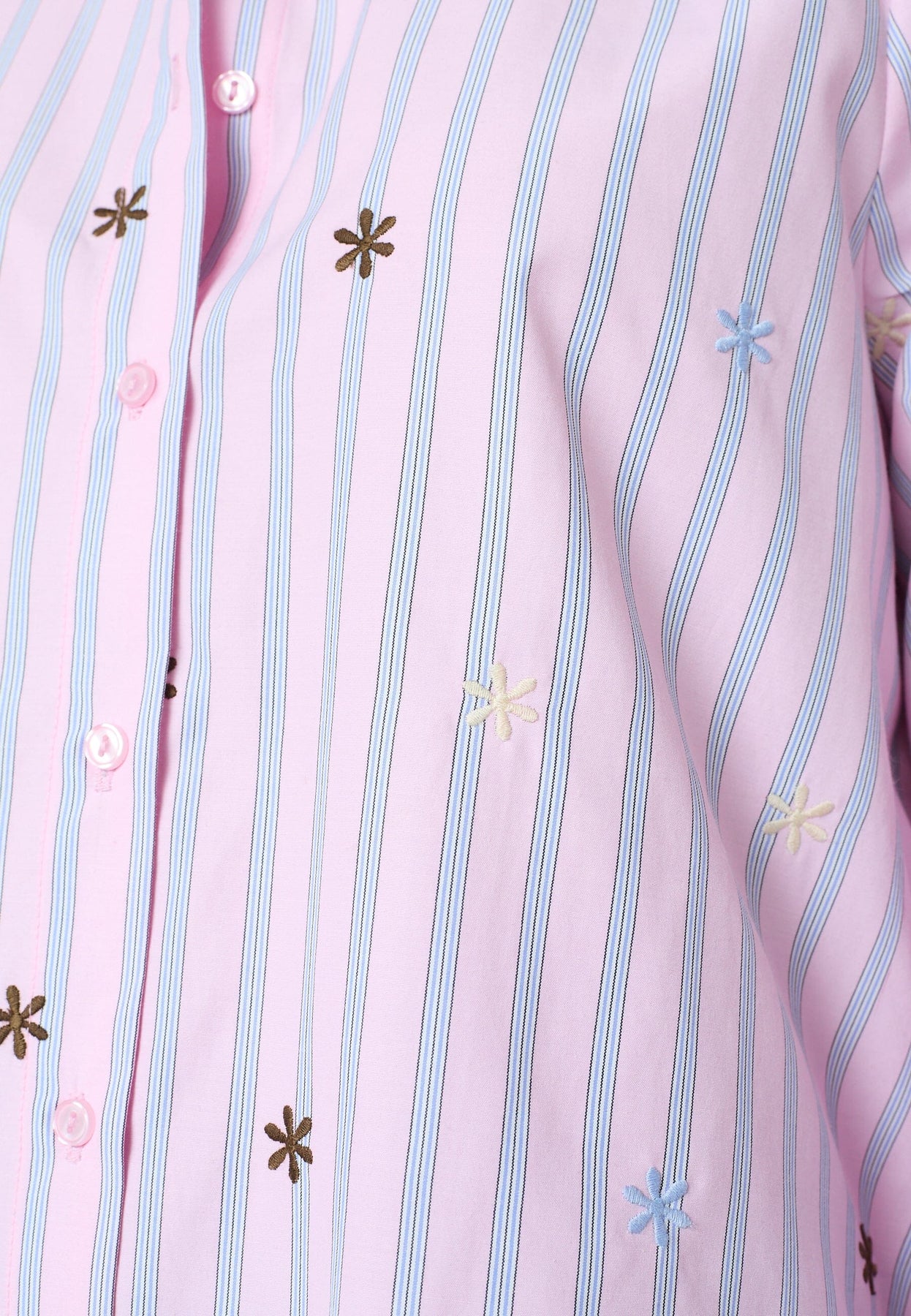 Gestreiftes Hemd von Sisters Point mit gestickten Blumendetails. Das Hemd hat hellblaue und hellrosa Streifen auf weißem Grund.