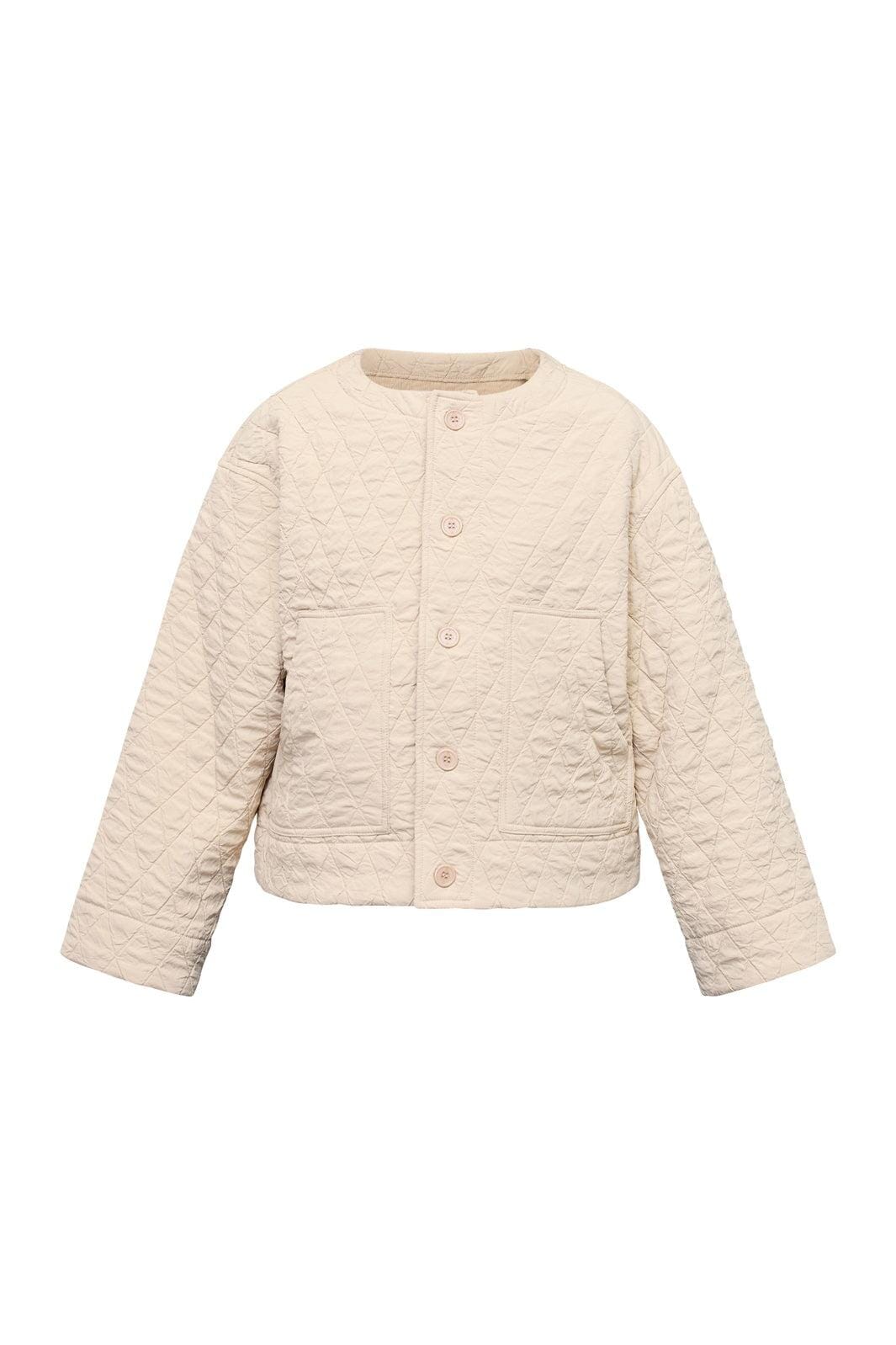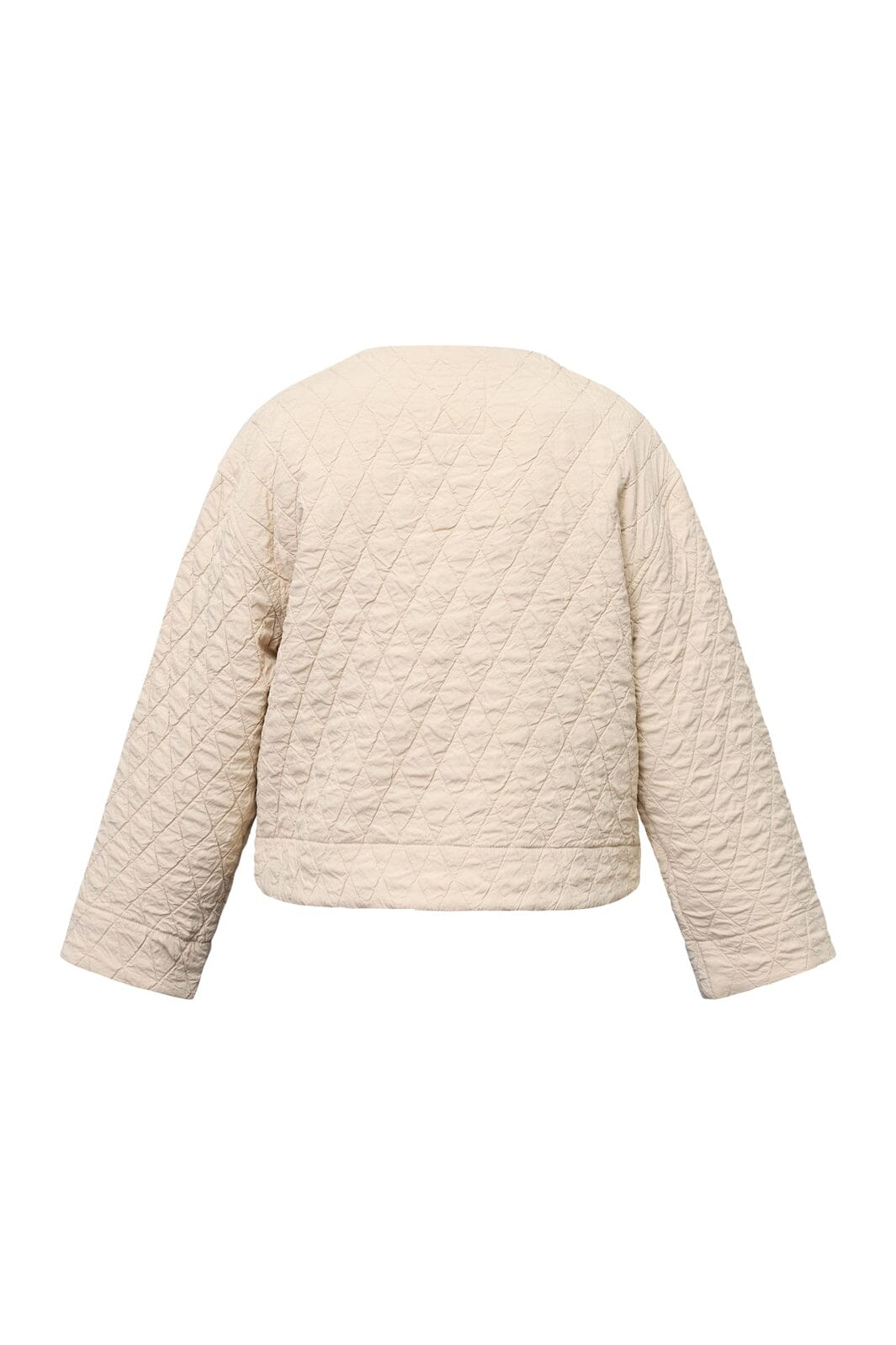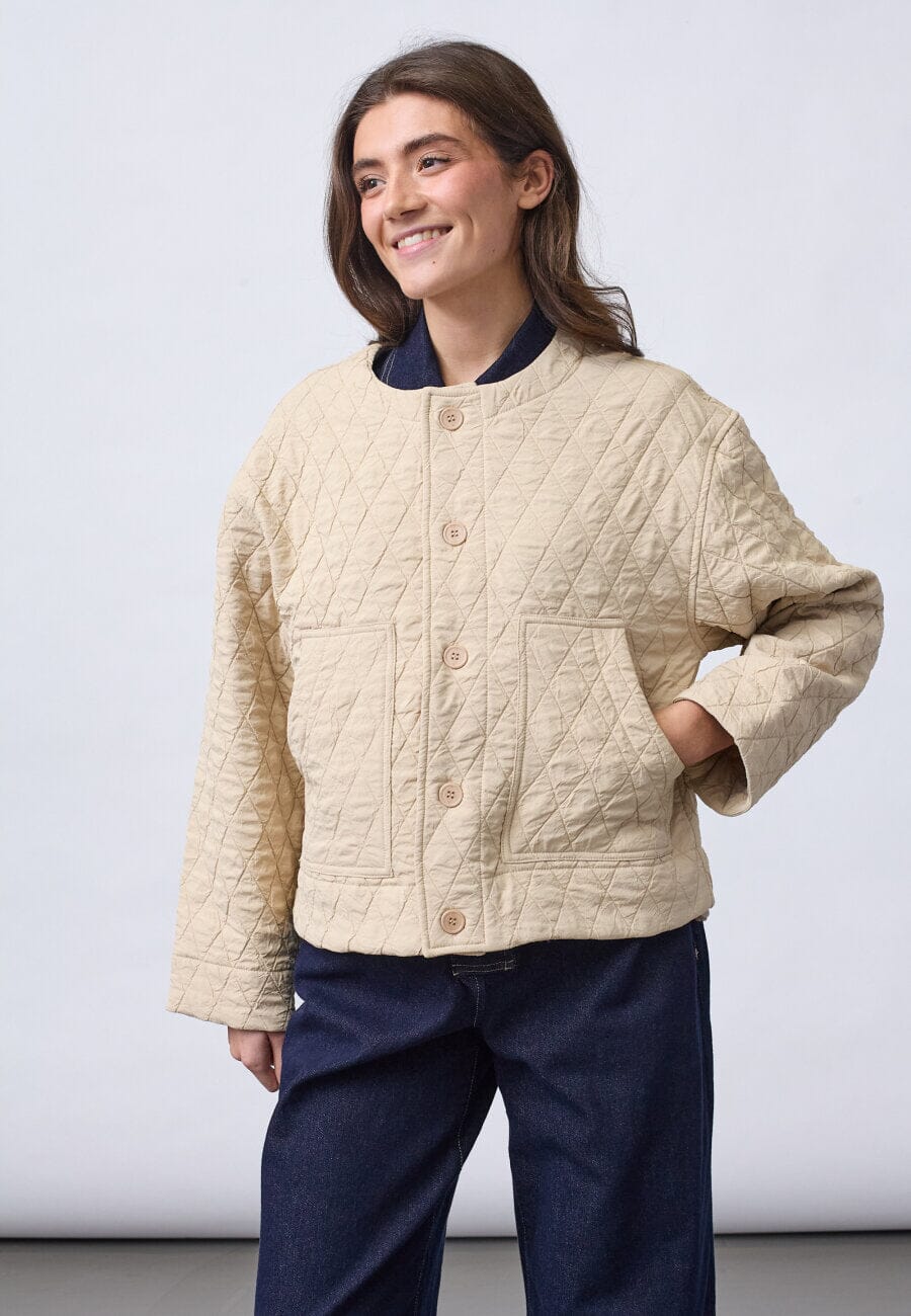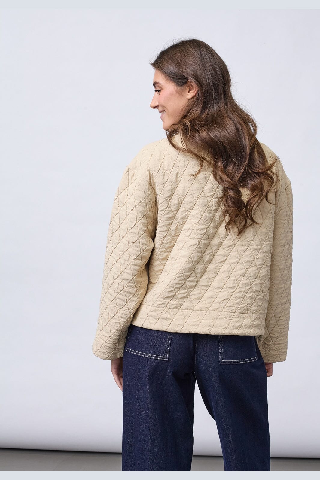 Gesteppte Jacke von Sisters Point in Beige mit klassischem Karomuster. Die Jacke hat eine lockere, kastenförmige Passform und besteht aus einem leichten, strukturierten Material.