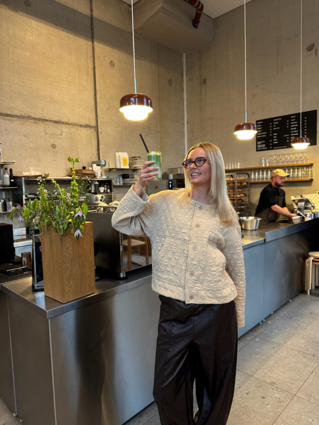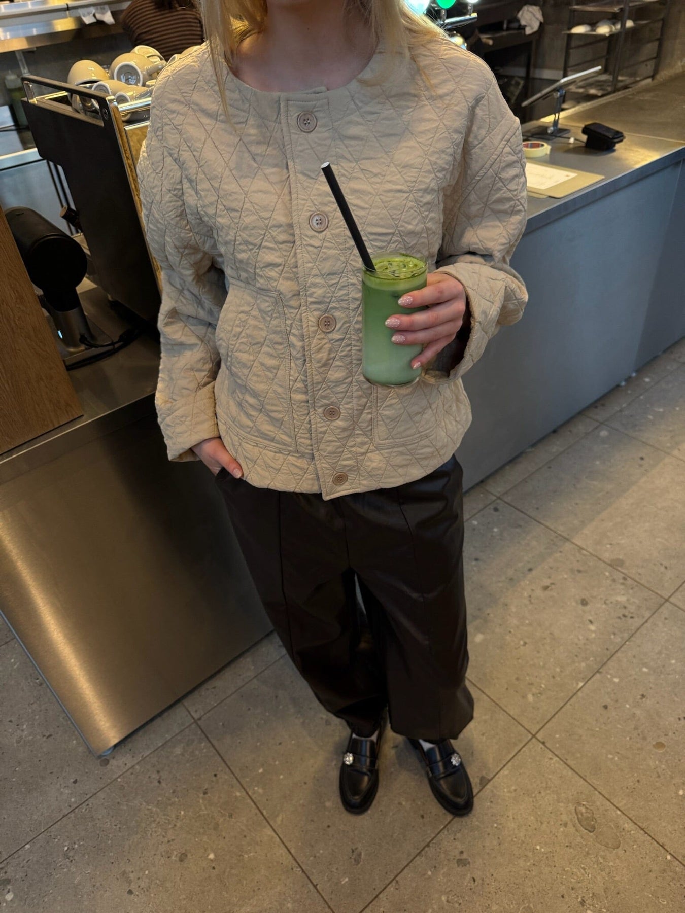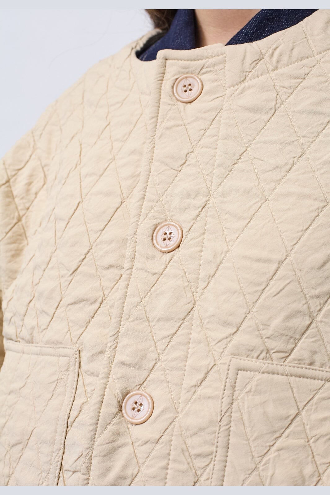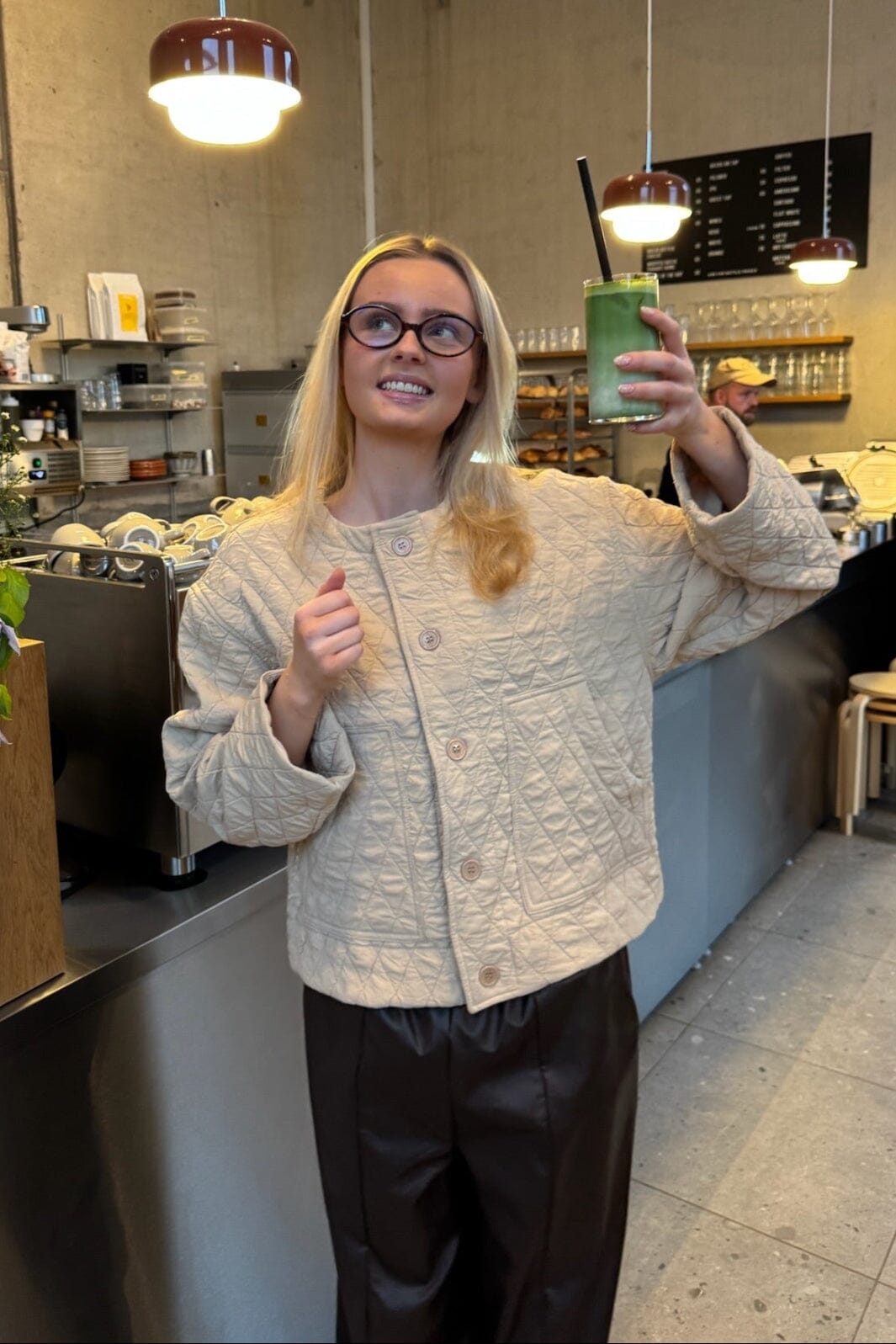 Gesteppte Jacke von Sisters Point in Beige mit klassischem Karomuster. Die Jacke hat eine lockere, kastenförmige Passform und besteht aus einem leichten, strukturierten Material.