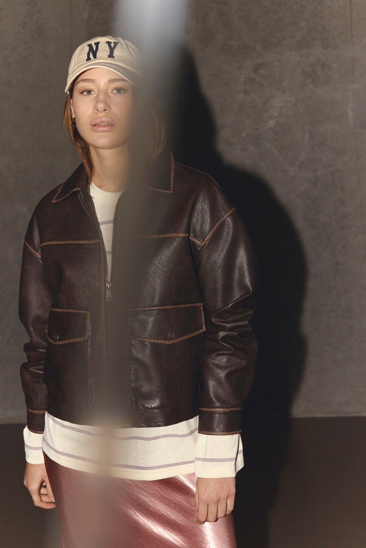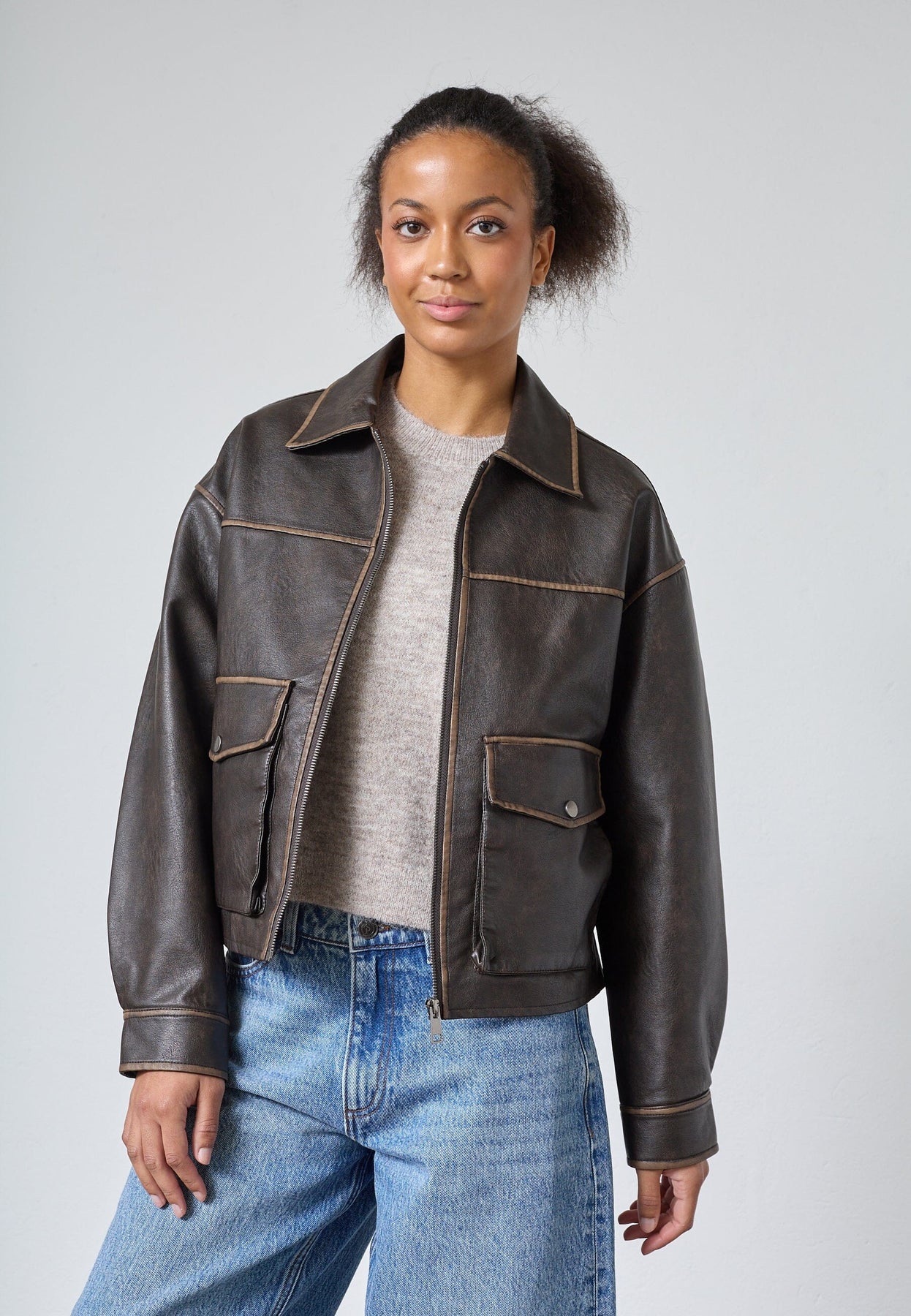 Braune Jacke aus Kunstleder von Sisters Point. Die Jacke hat einen Kragen und einen Frontreißverschluss mit betonten Nähten entlang der Kanten.