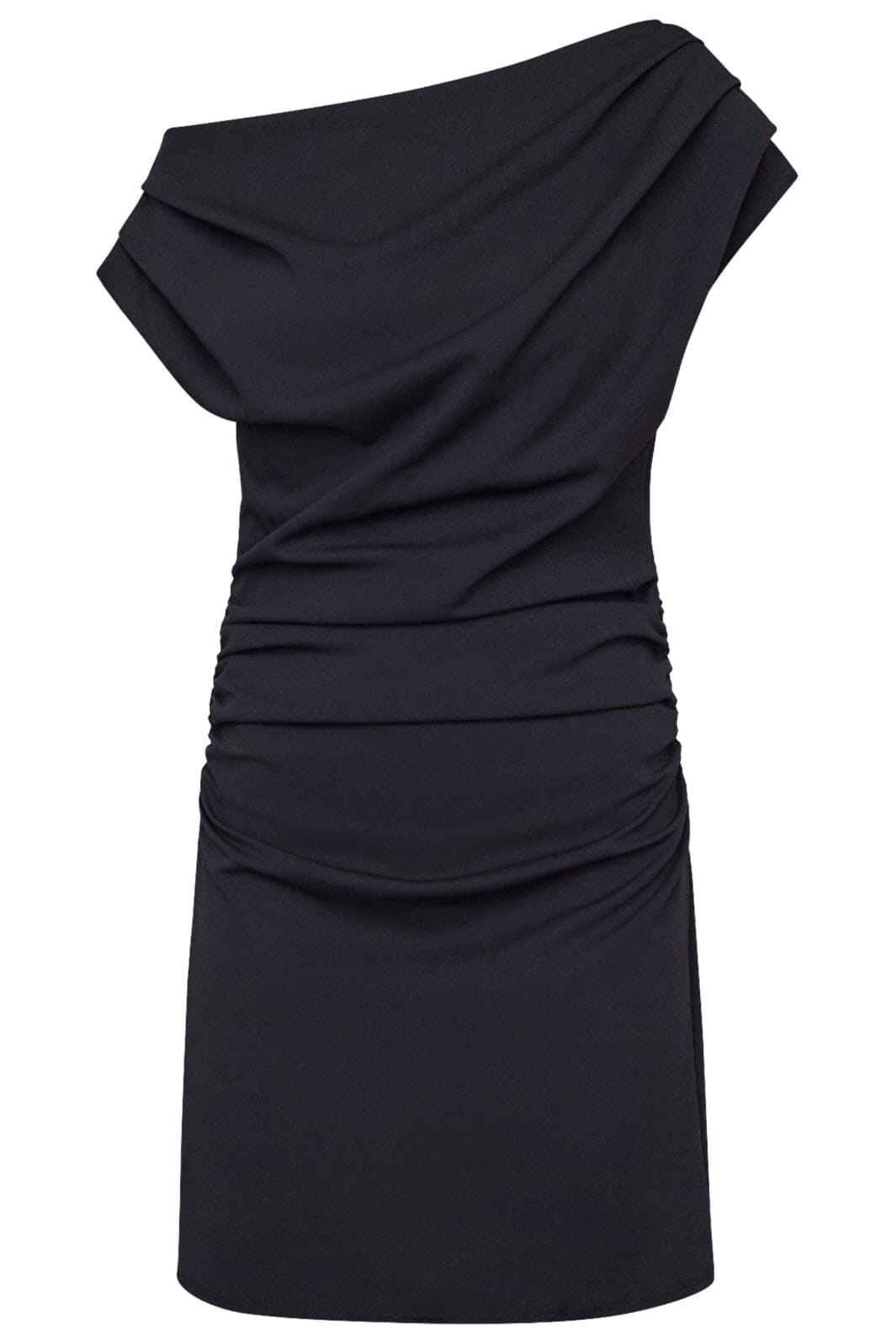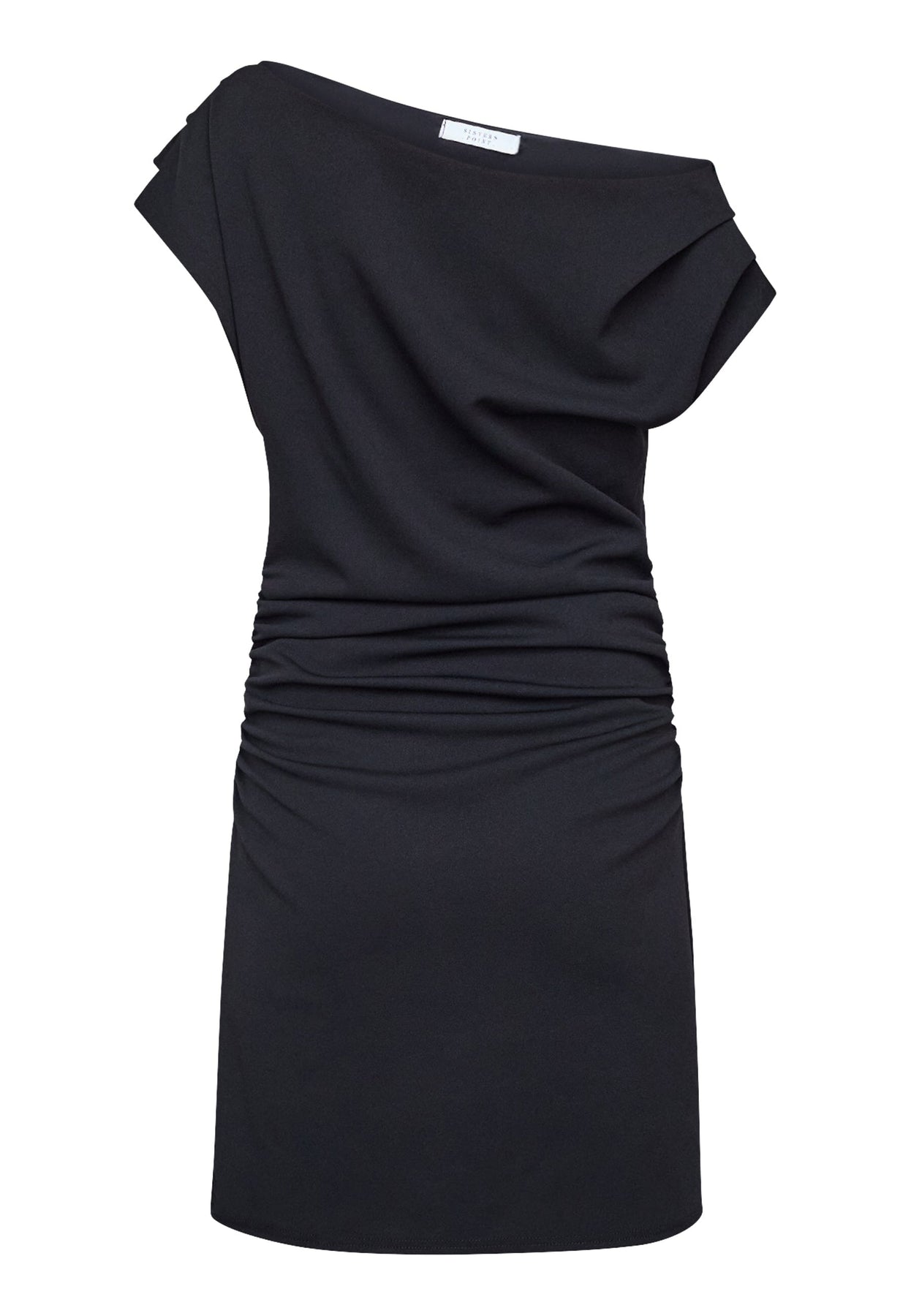 Schwarzes Kleid von Sisters Point mit Off-Shoulder-Design und gerafften Details entlang der Seiten. Das Kleid hat eine figurbetonte Passform und endet oberhalb des Knies.