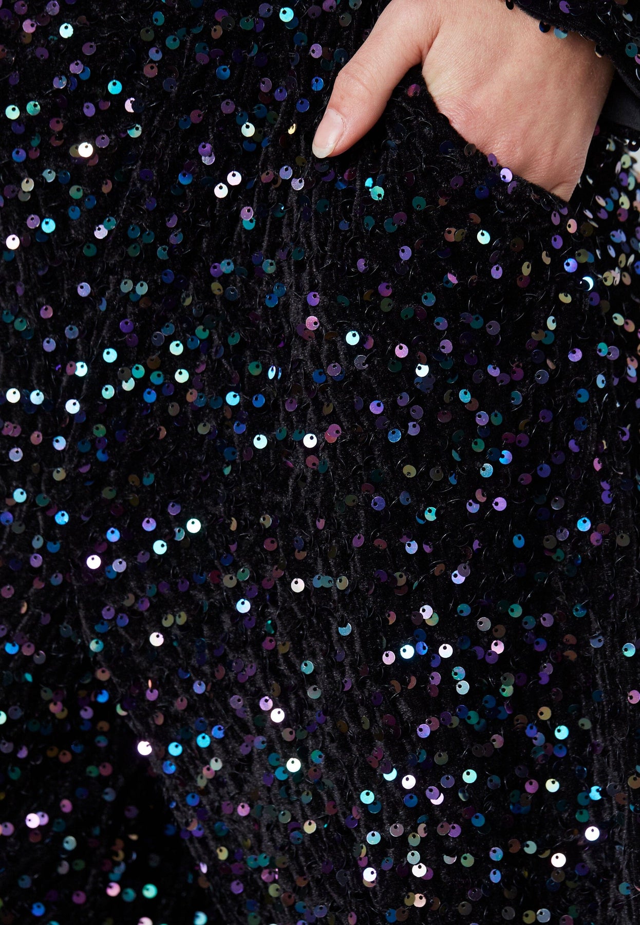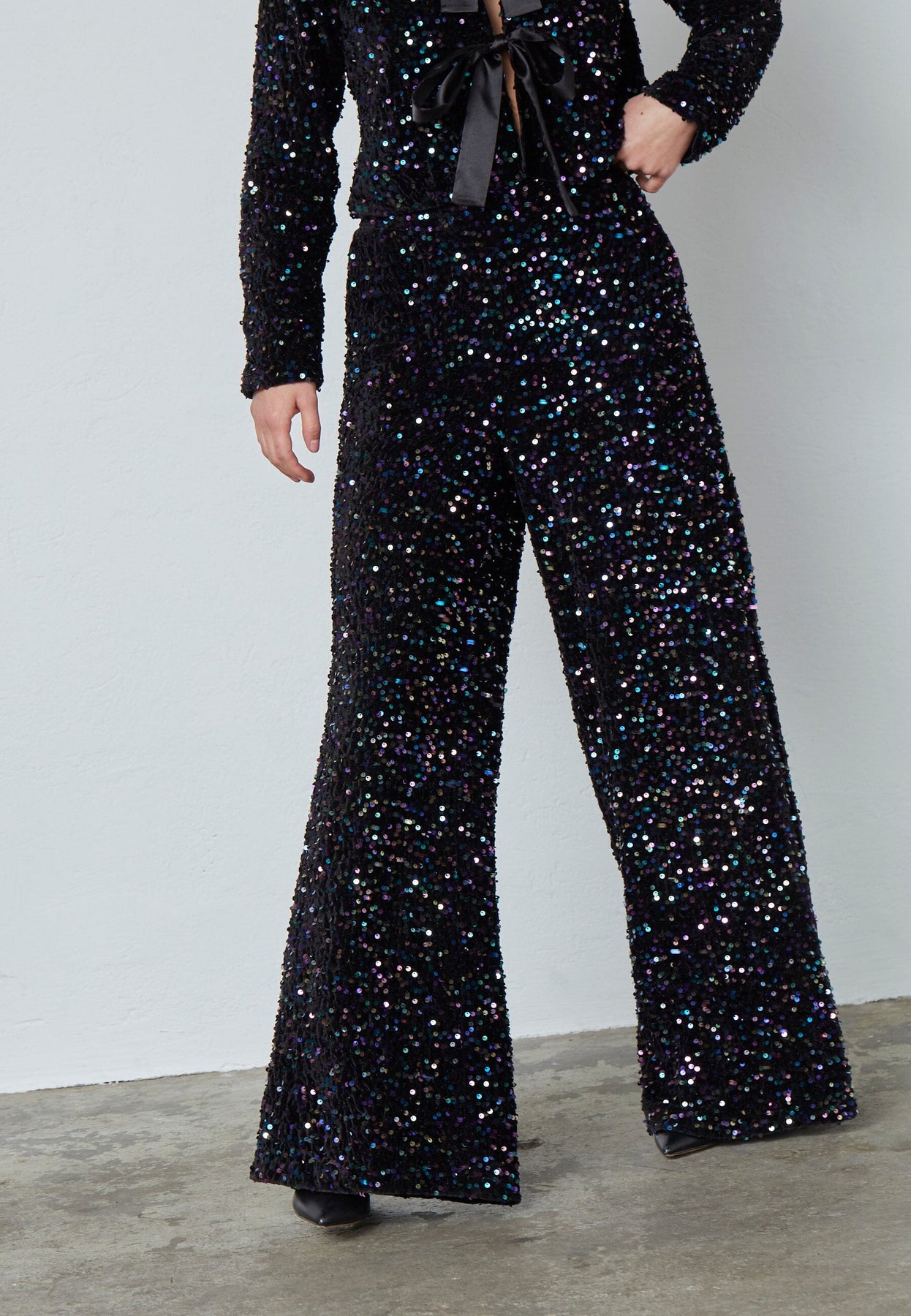 Schwarze Hosen von Sisters Point mit lockerer Passform und weitem Bein. Die Hosen sind mit mehrfarbigen Pailletten bedeckt, die einen festlichen Ausdruck verleihen. Der Gummizug in der Taille sorgt für eine gute Passform.