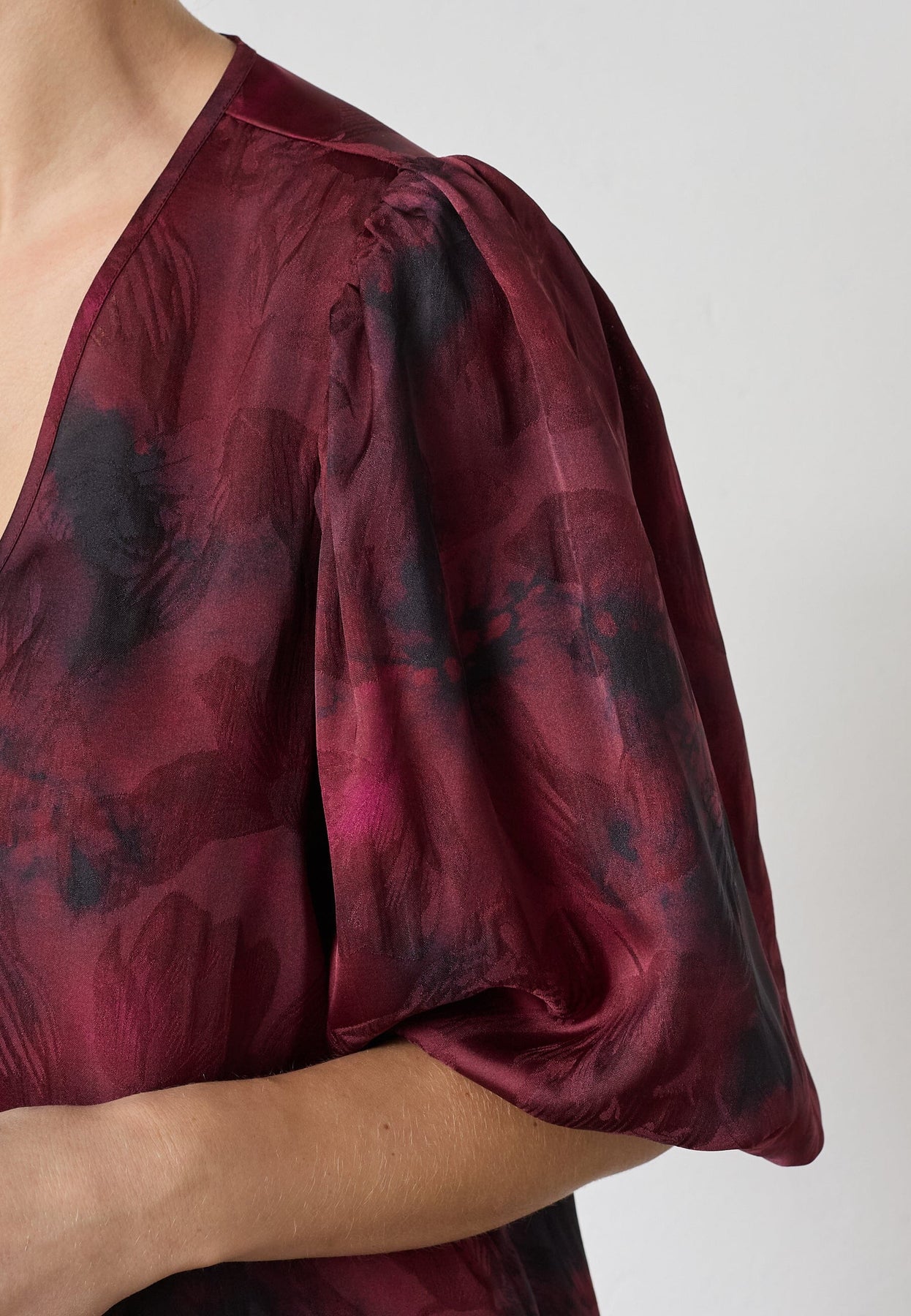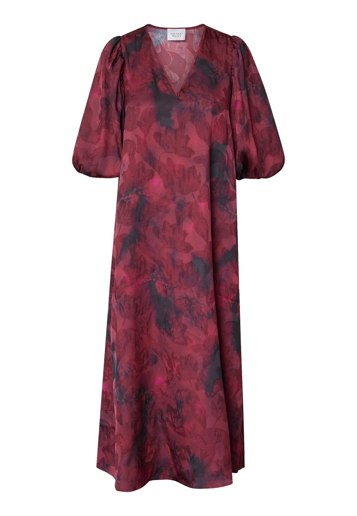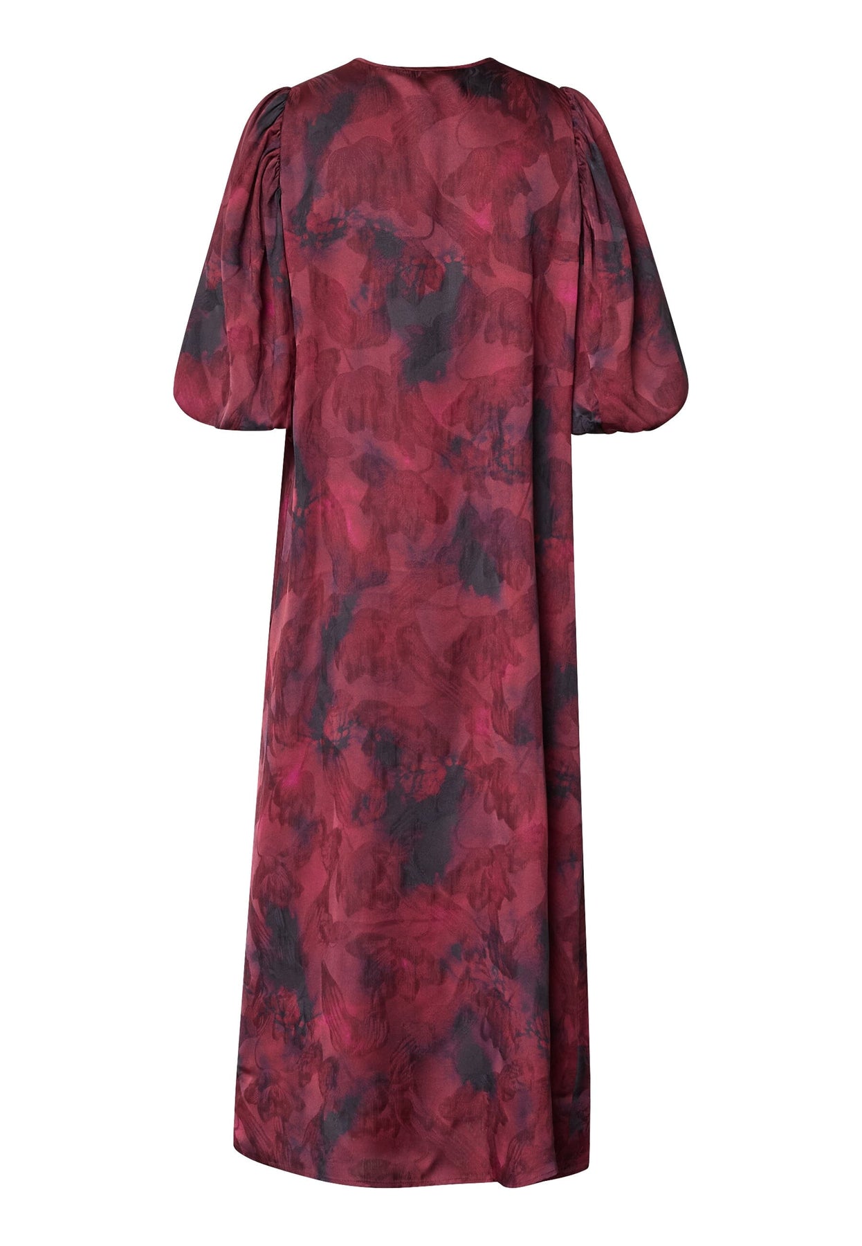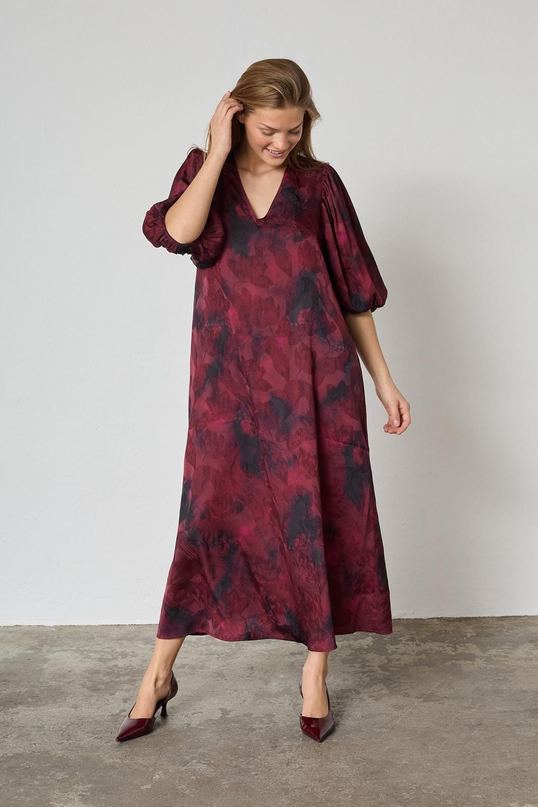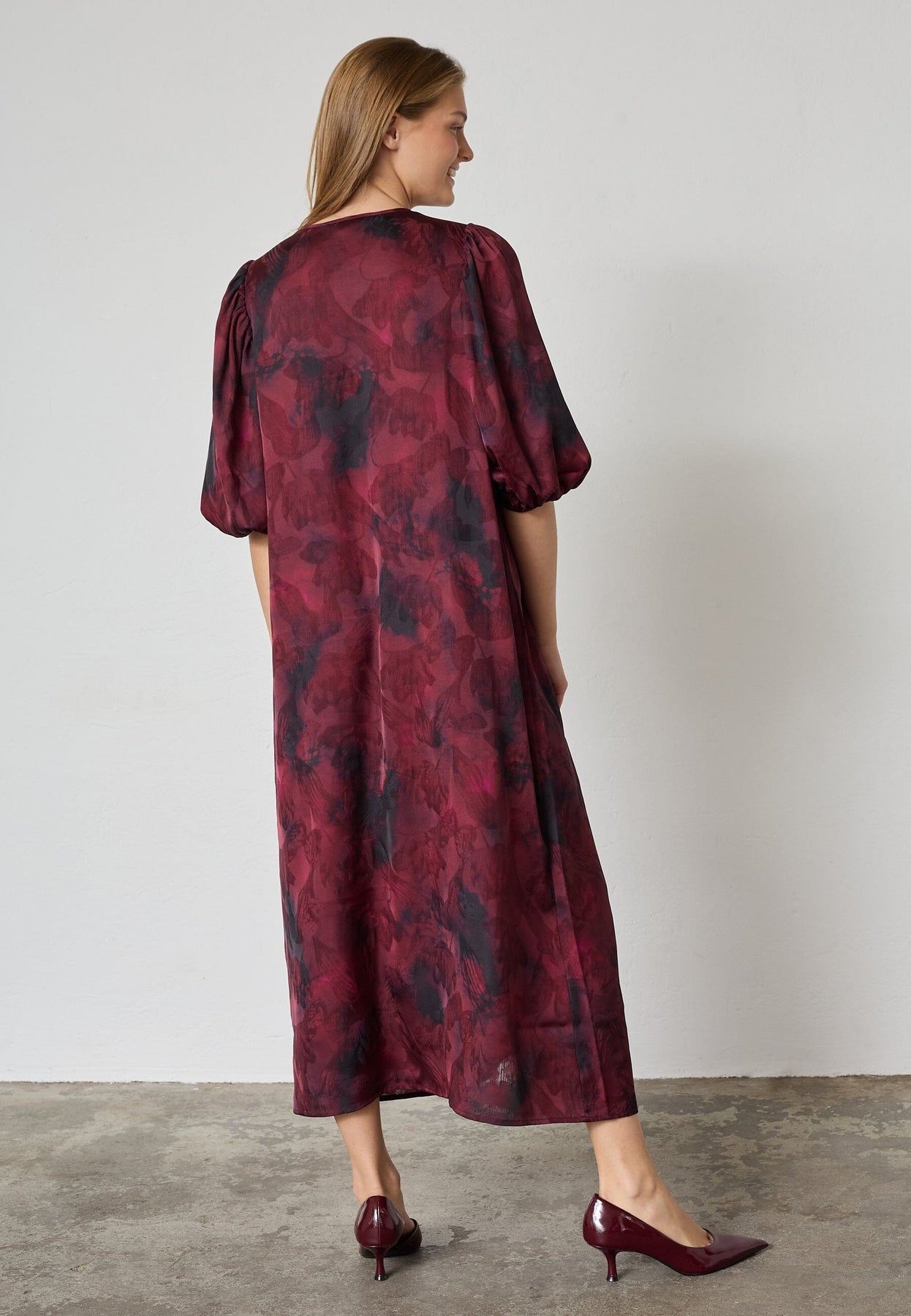 Kleid von Sisters Point in Bordeaux mit einem verschwommenen, mehrfarbigen Print. Das Kleid hat einen V-Ausschnitt und dreiviertellange Puffärmel mit Gummizug am Ende.
