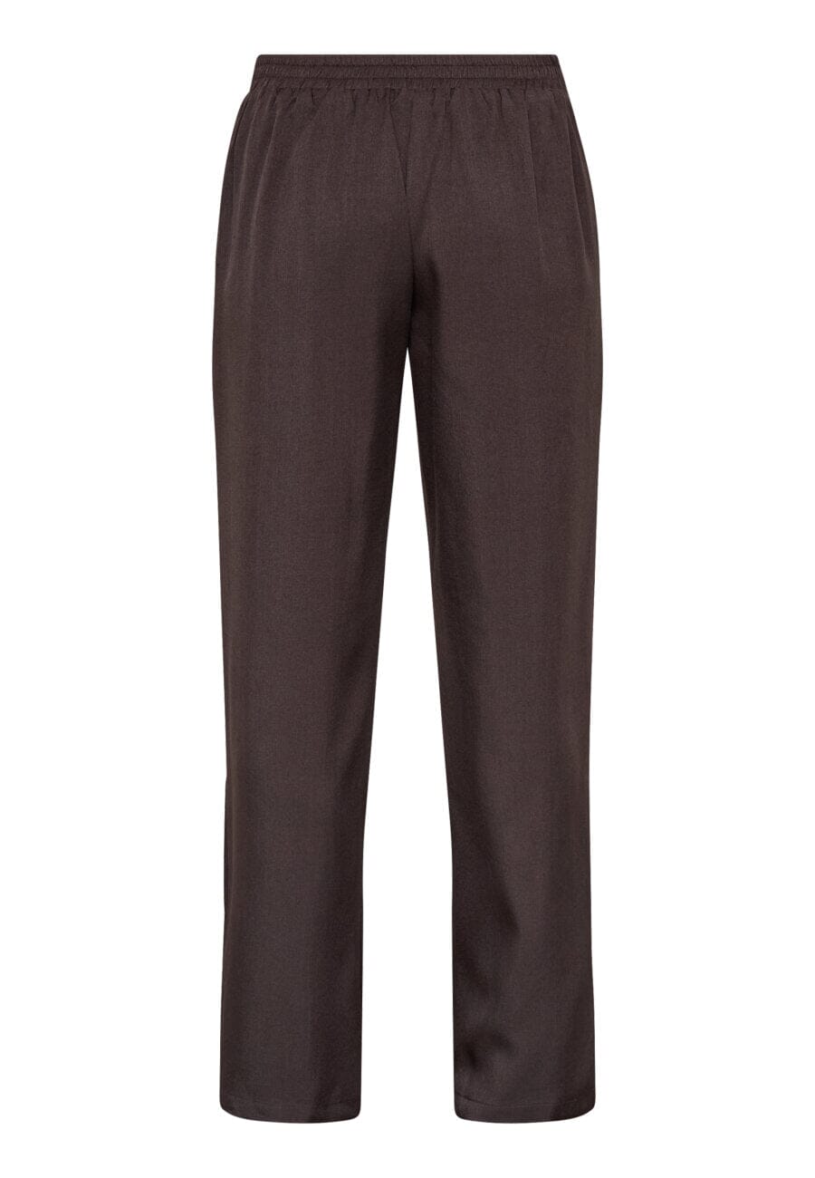 Dunkelbraune Hose von Sisters Point mit lockerem Schnitt und bodenlanger Länge. Die Hose hat weite Beine und Bügelfalten vorne.