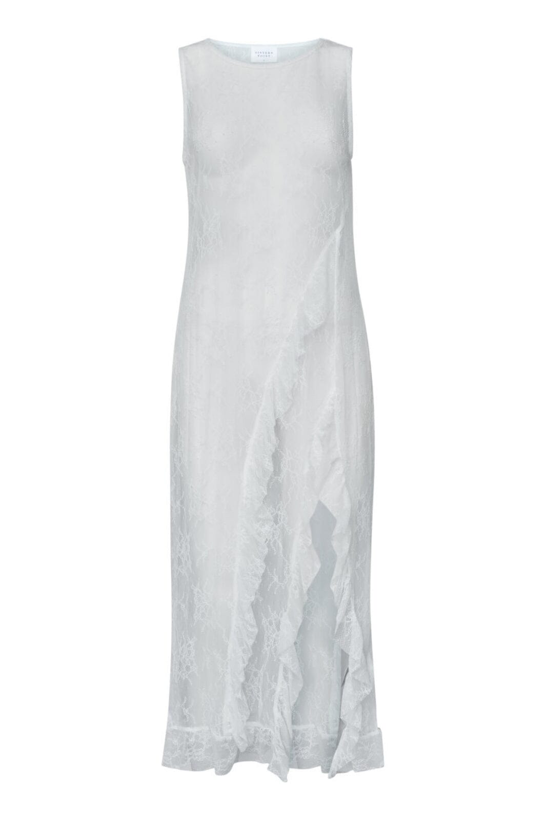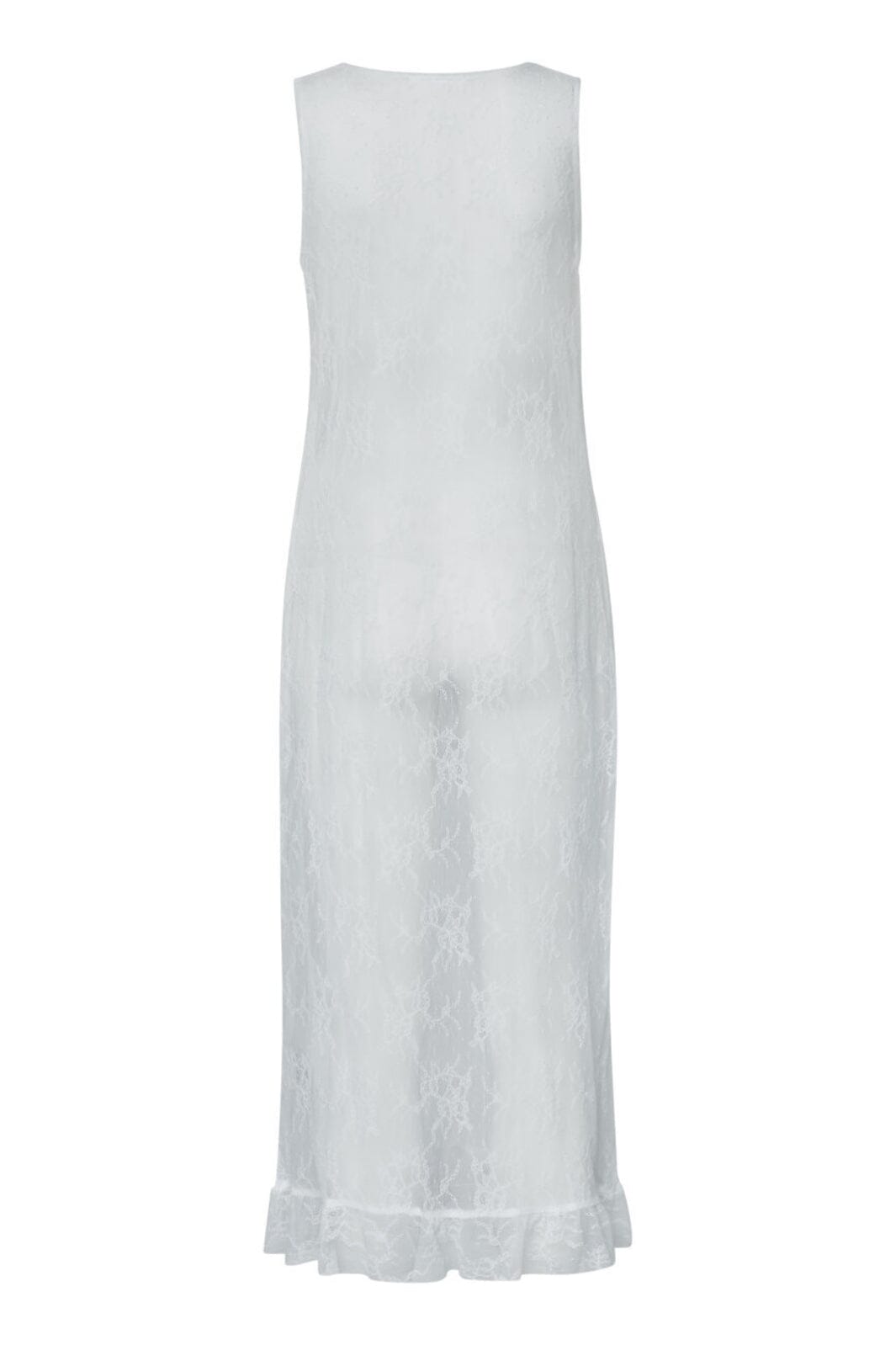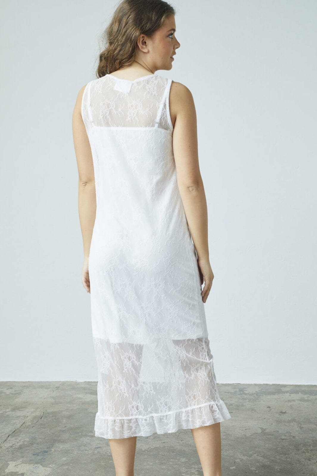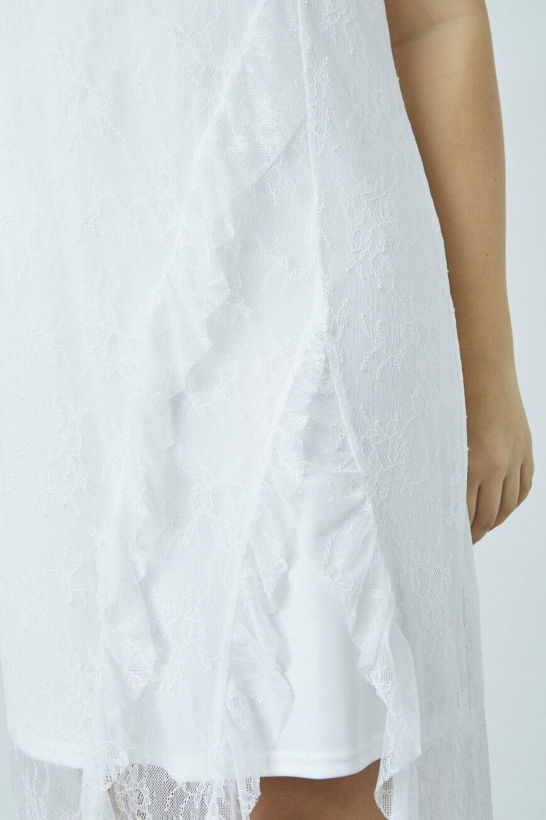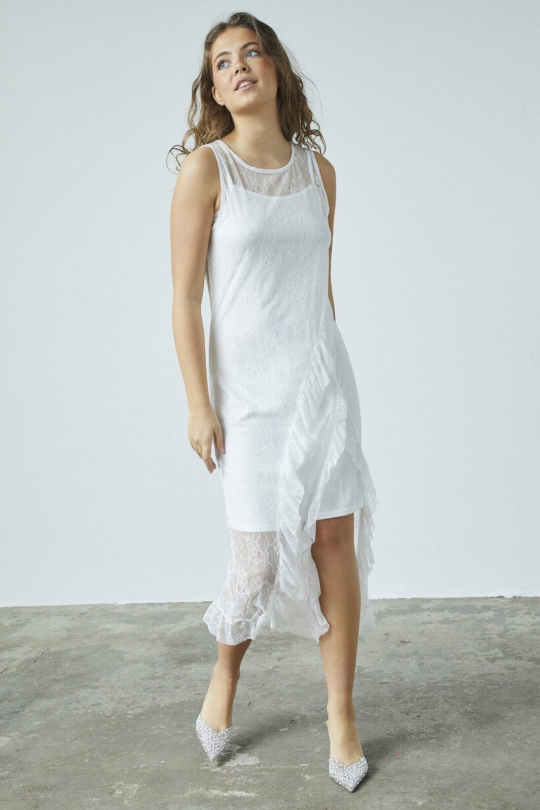 Weißes Spitzenkleid von Sisters Point mit transparentem Überzug und Rüschen. Die lockere Passform und der asymmetrische Saum verleihen dem Kleid einen luftigen Ausdruck. Das Kleid kann über einer Jeans getragen werden.