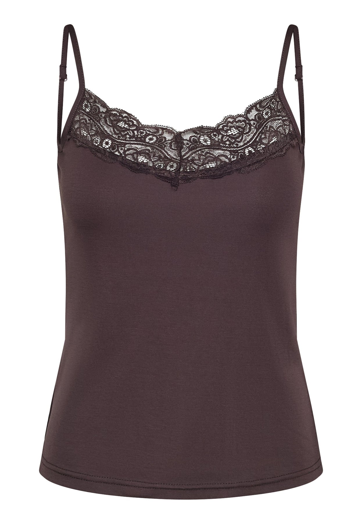 Top von Sisters Point in einem tiefen schokoladenbraunen Farbton. Hergestellt aus 60 % Viskose, 35 % Polyester und 5 % Elasthan.