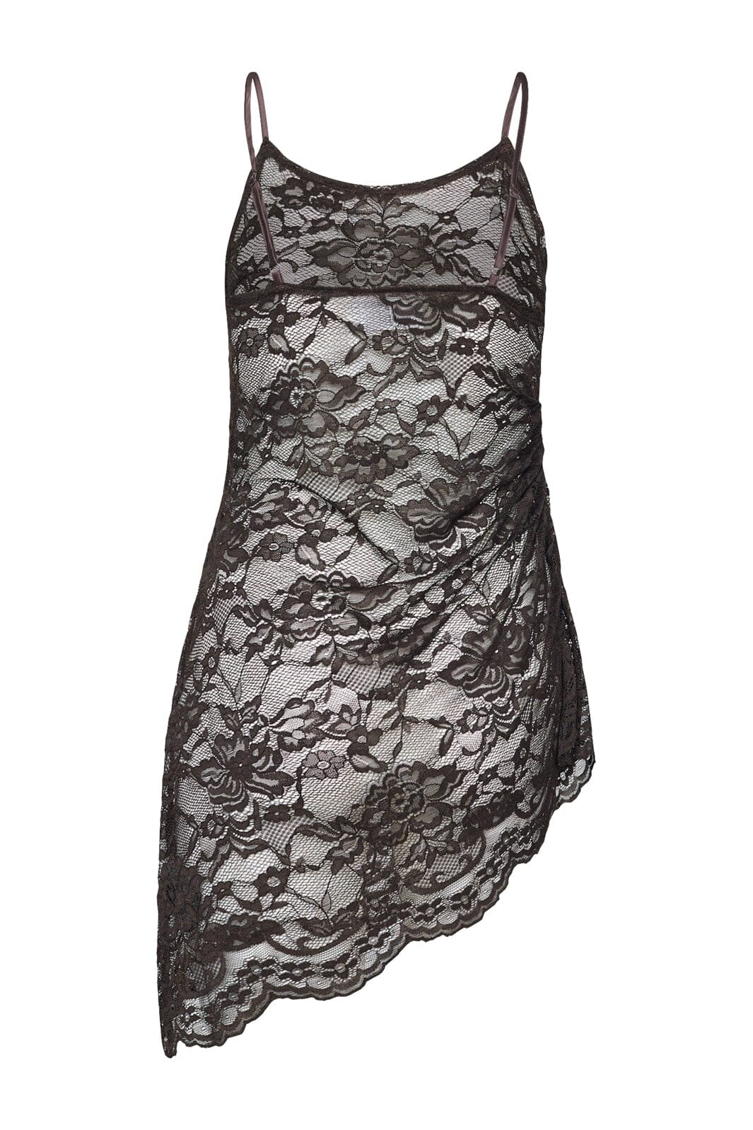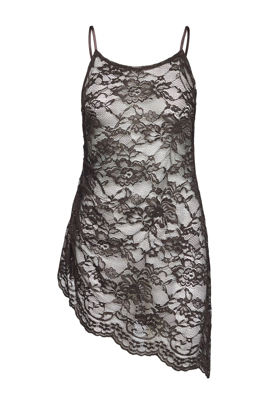 Spitzenkleid von Sisters Point in einem tiefen Braunton. Das Kleid ist transparent und hat ein ganzflächiges Blumenmuster aus Spitze.