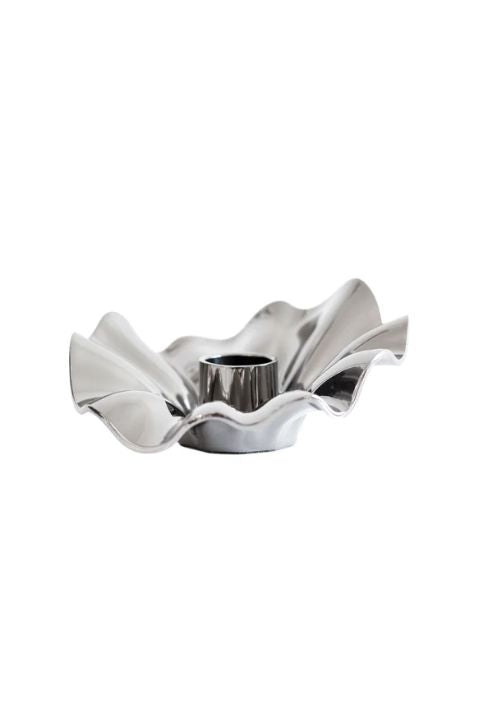 Kerzenhalter von Specktrum, aus Metall mit einer silberfarbenen Chromoberfläche. Das Design hat eine wellige, blumenähnliche Form mit einer reflektierenden Oberfläche.
