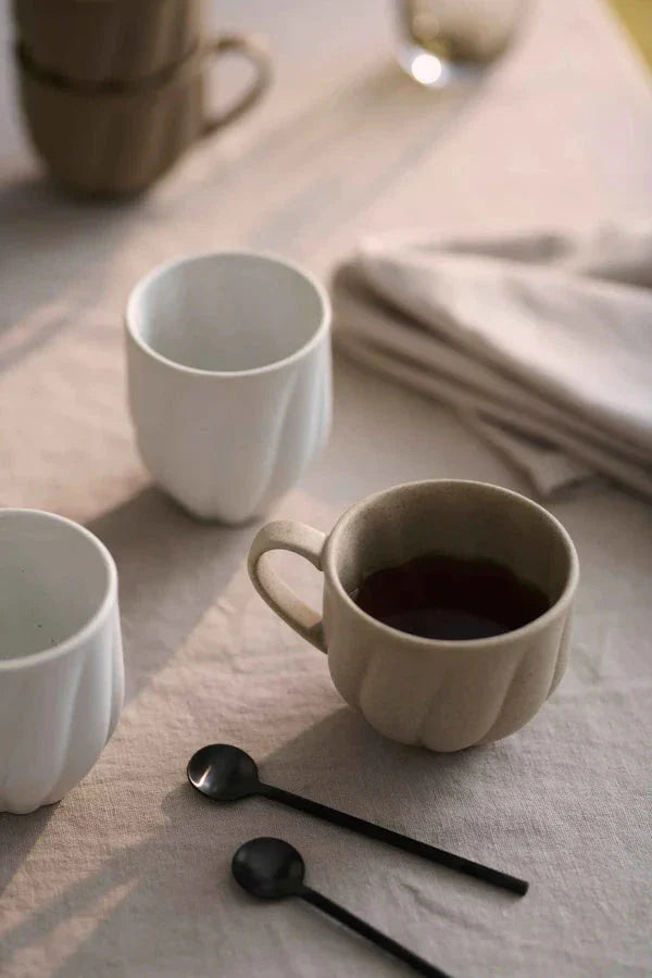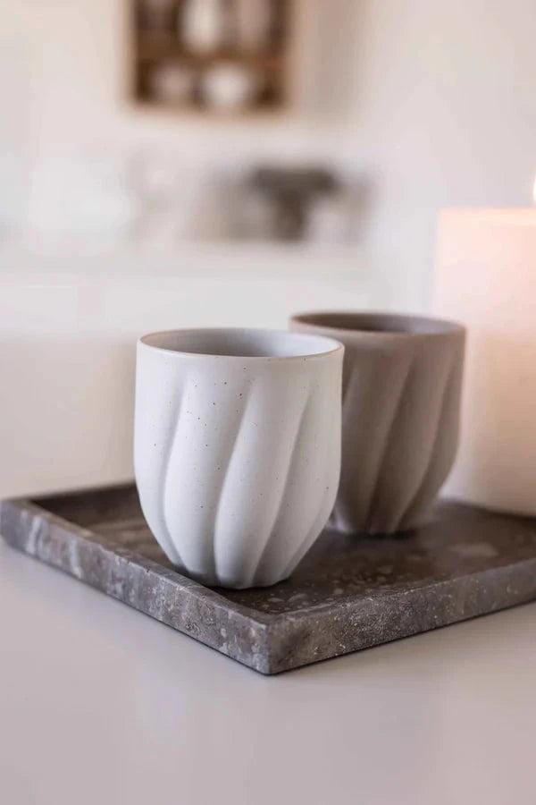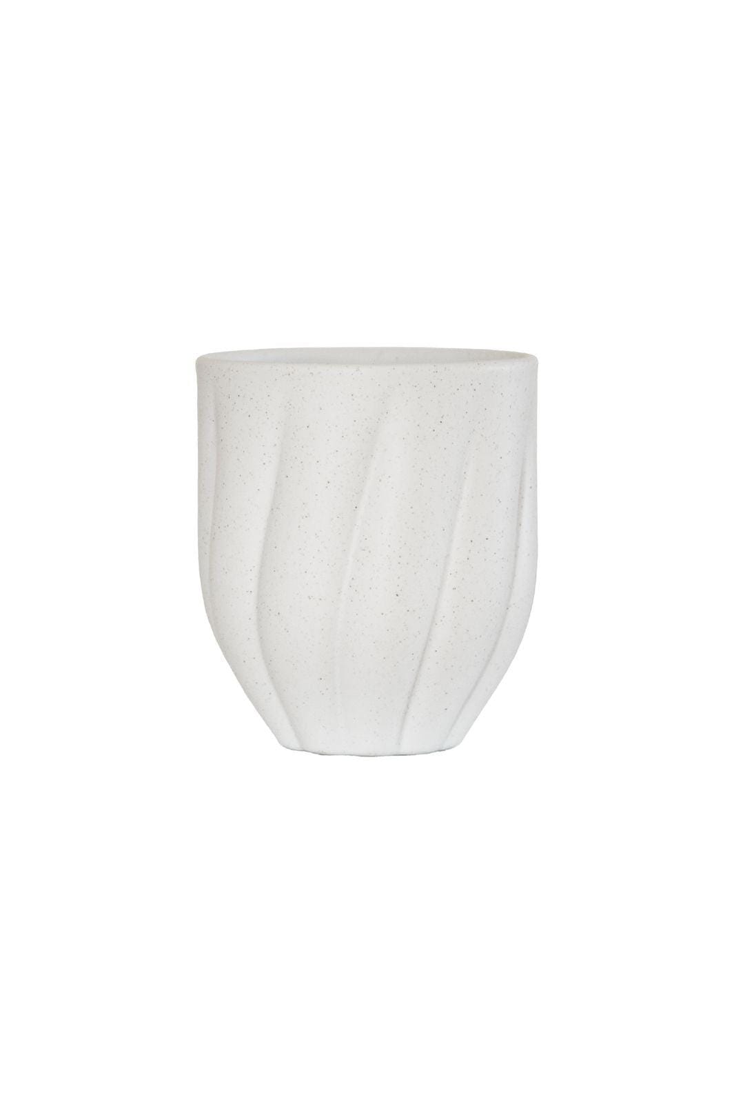 Keramische Tasse von Specktrum mit wellenförmigen Linien auf der Oberfläche. Die cremeweiße Tasse hat eine leicht verjüngte Form zur Basis hin und ist ohne Henkel gestaltet für einen klaren Look.