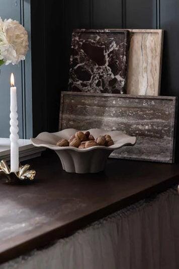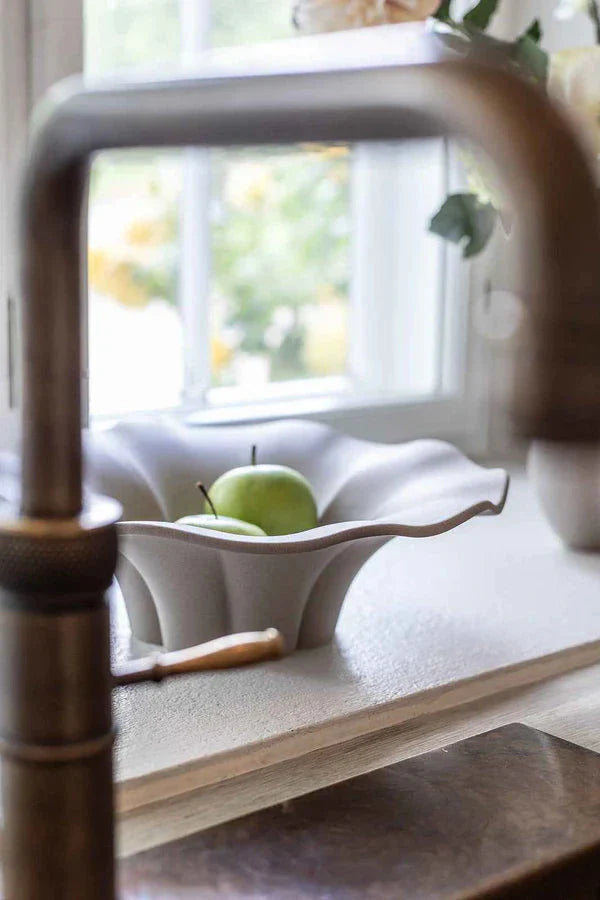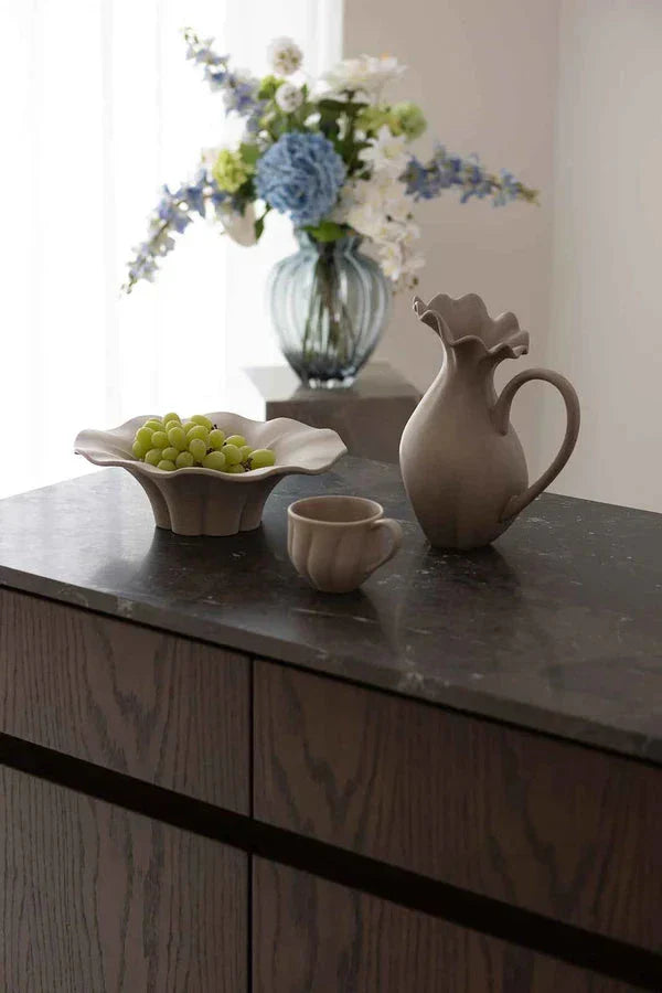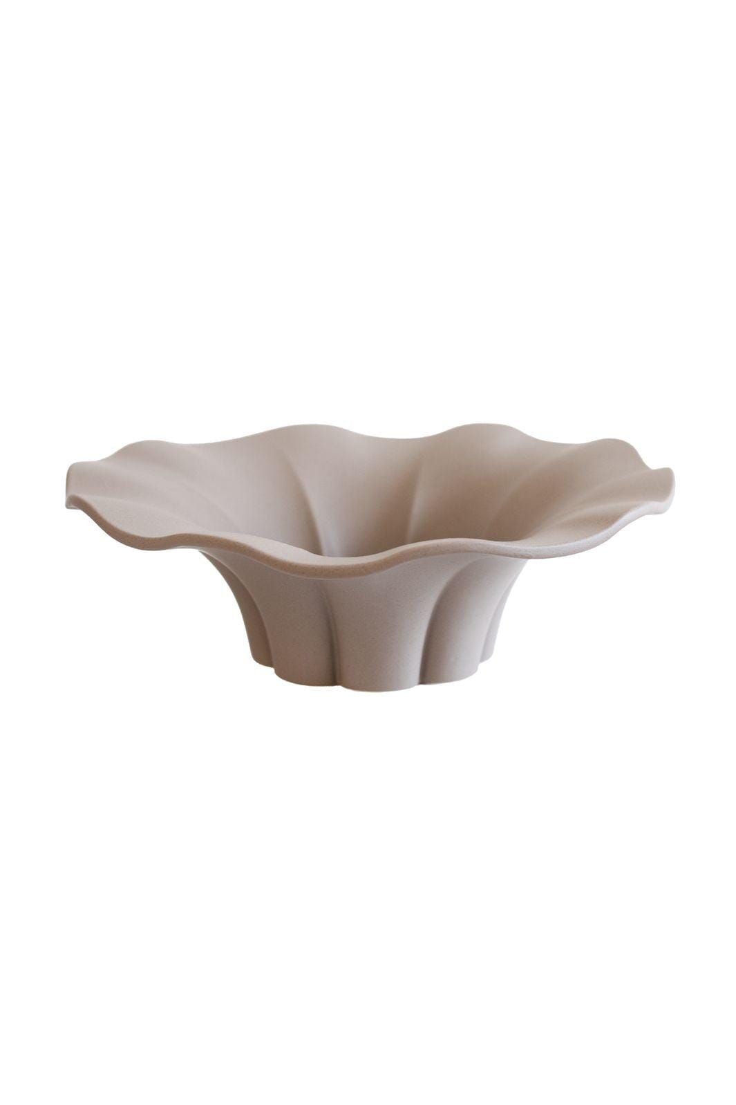 Sandfarbene Keramikschale von Specktrum mit gewelltem Rand und matter Oberfläche. Die Schale wird durch traditionelles Handwerk hergestellt, was jedem Stück seinen eigenen Charakter verleiht.