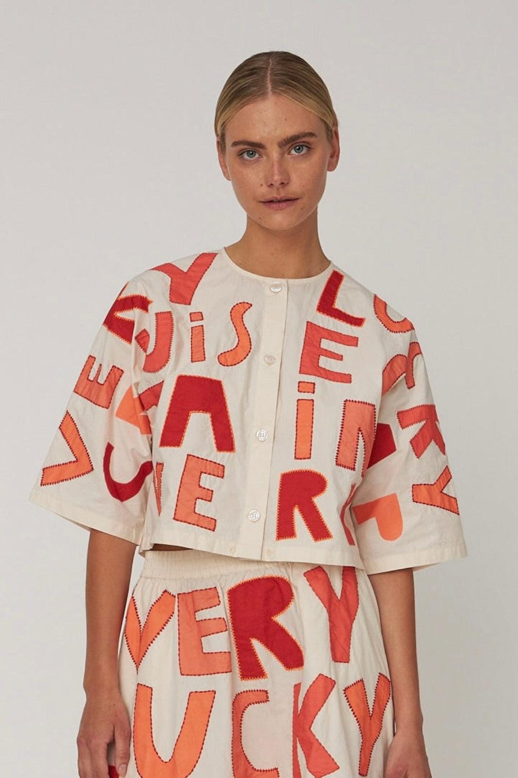 Hemd von Stella Nova mit einem Druckmuster aus großen Buchstaben in roten und orangefarbenen Nuancen auf hellem Hintergrund. Das Hemd besteht aus Bio-Baumwolle.