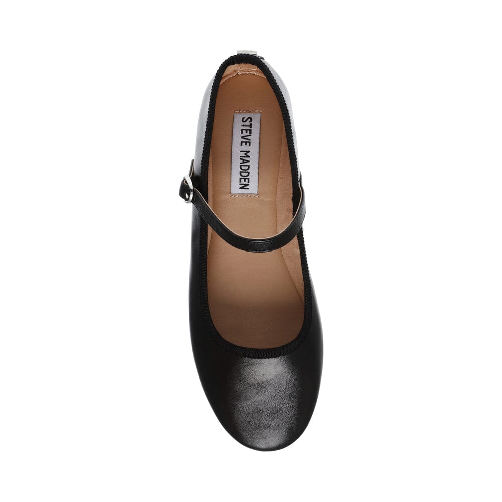 Schwarze Ballerina von Steve Madden aus Leder mit spitzer Zehe und Knöchelriemen. Der Schuh hat ein klares Design mit Fokus auf Komfort und Anwendbarkeit für Alltag und Fest.