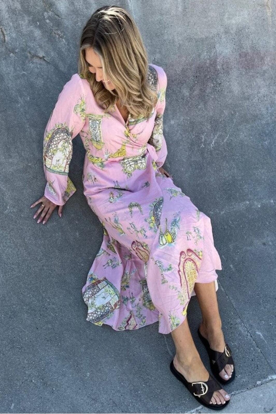 Rosa Kleid von Stories From The Atelier by Copenhagen Shoes, aus Viskose mit einem pastellfarbenen Print in mehreren Farben. Das Kleid hat lange Ärmel und einen V-Ausschnitt.