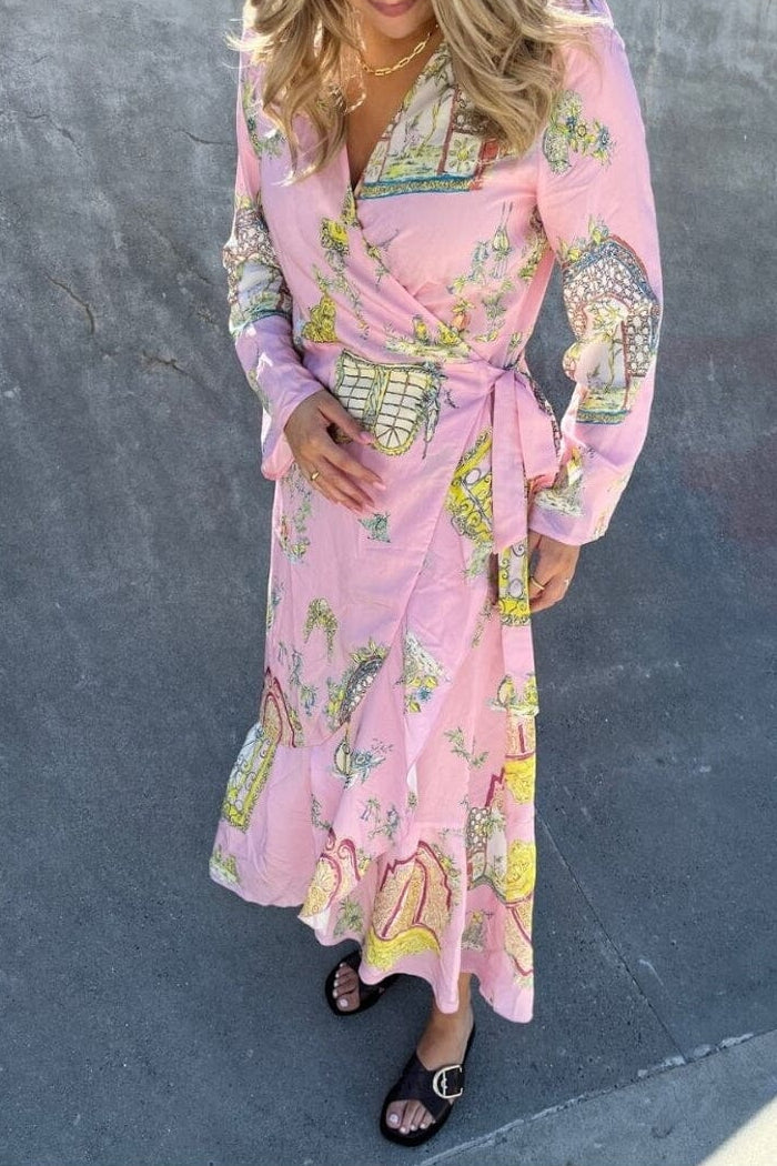 Rosa Kleid von Stories From The Atelier by Copenhagen Shoes, aus Viskose mit einem pastellfarbenen Print in mehreren Farben. Das Kleid hat lange Ärmel und einen V-Ausschnitt.