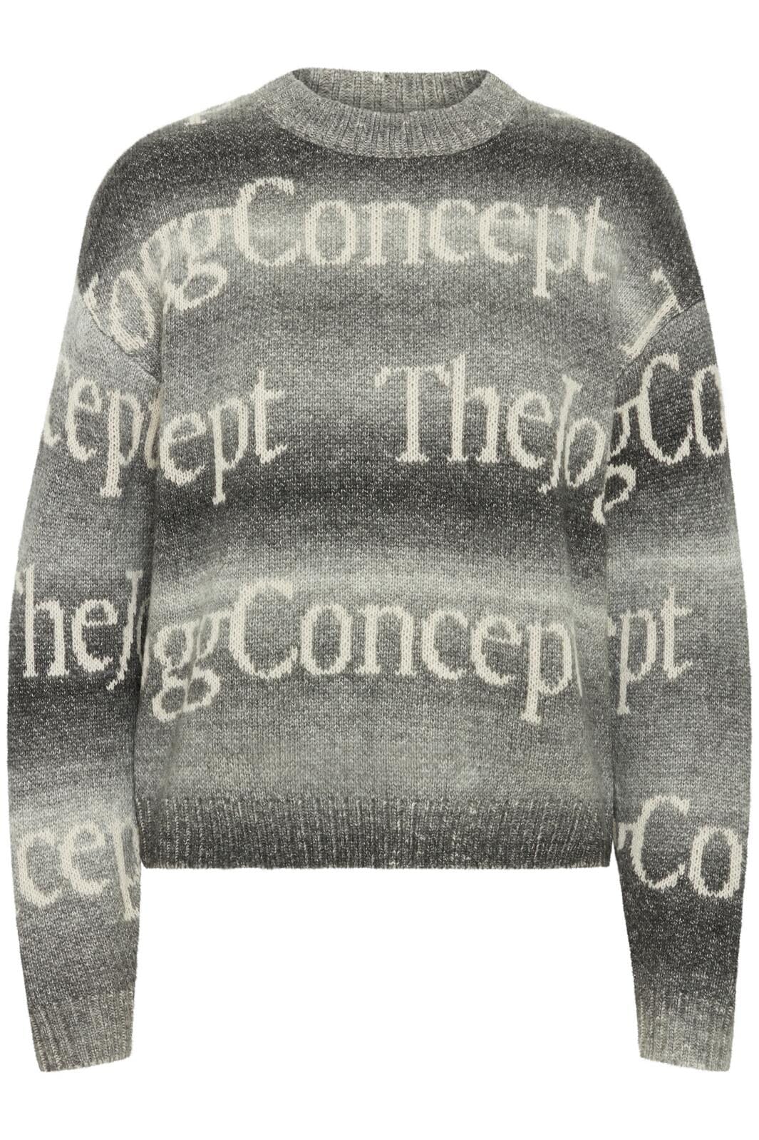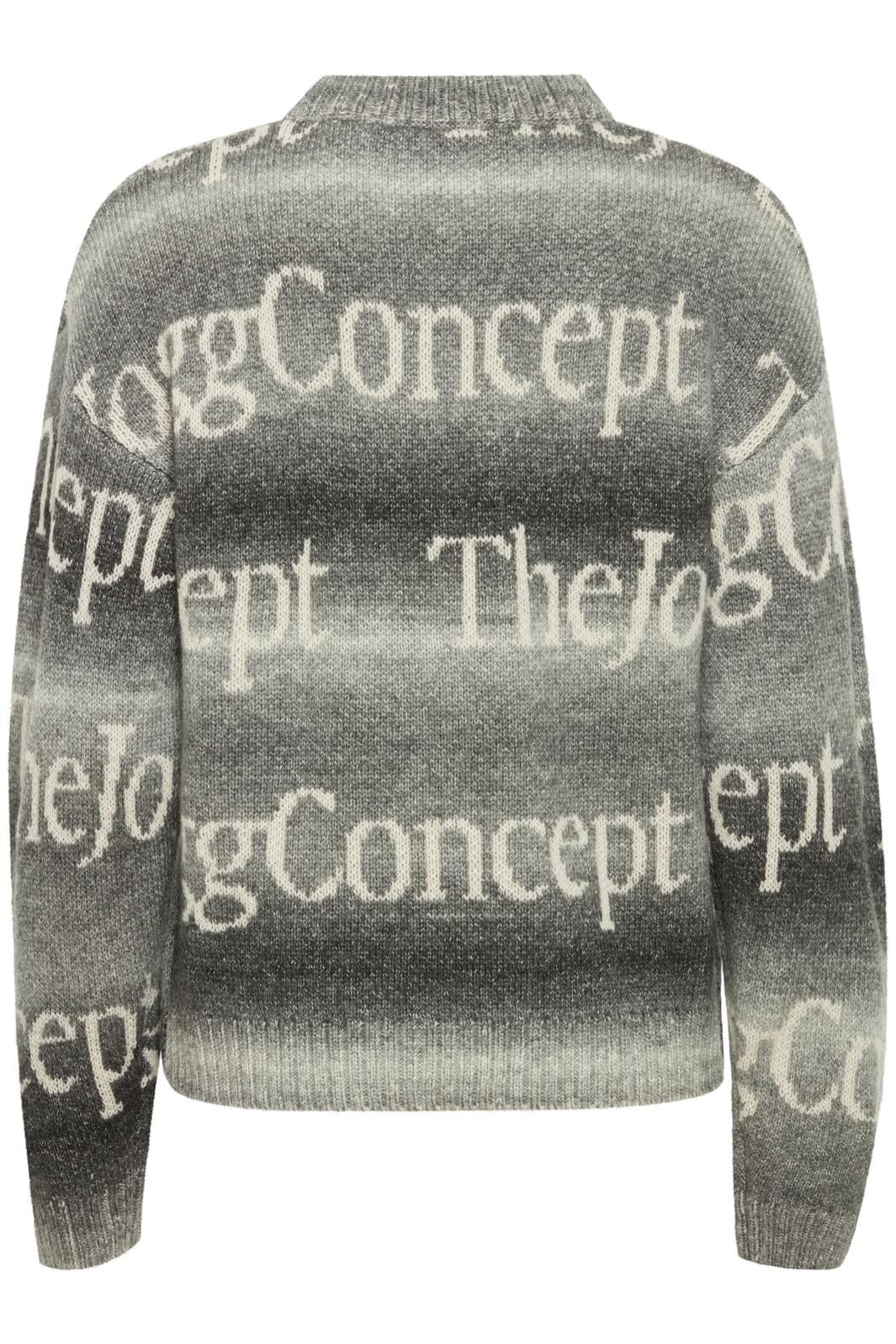 Strickpullover von The Jogg Concept mit grauen Farbverläufen. Sie hat einen Rundhalsausschnitt und lange Ärmel. Das Muster besteht aus dem Markennamen in hellen Buchstaben auf dem dunkelgrauen Hintergrund.