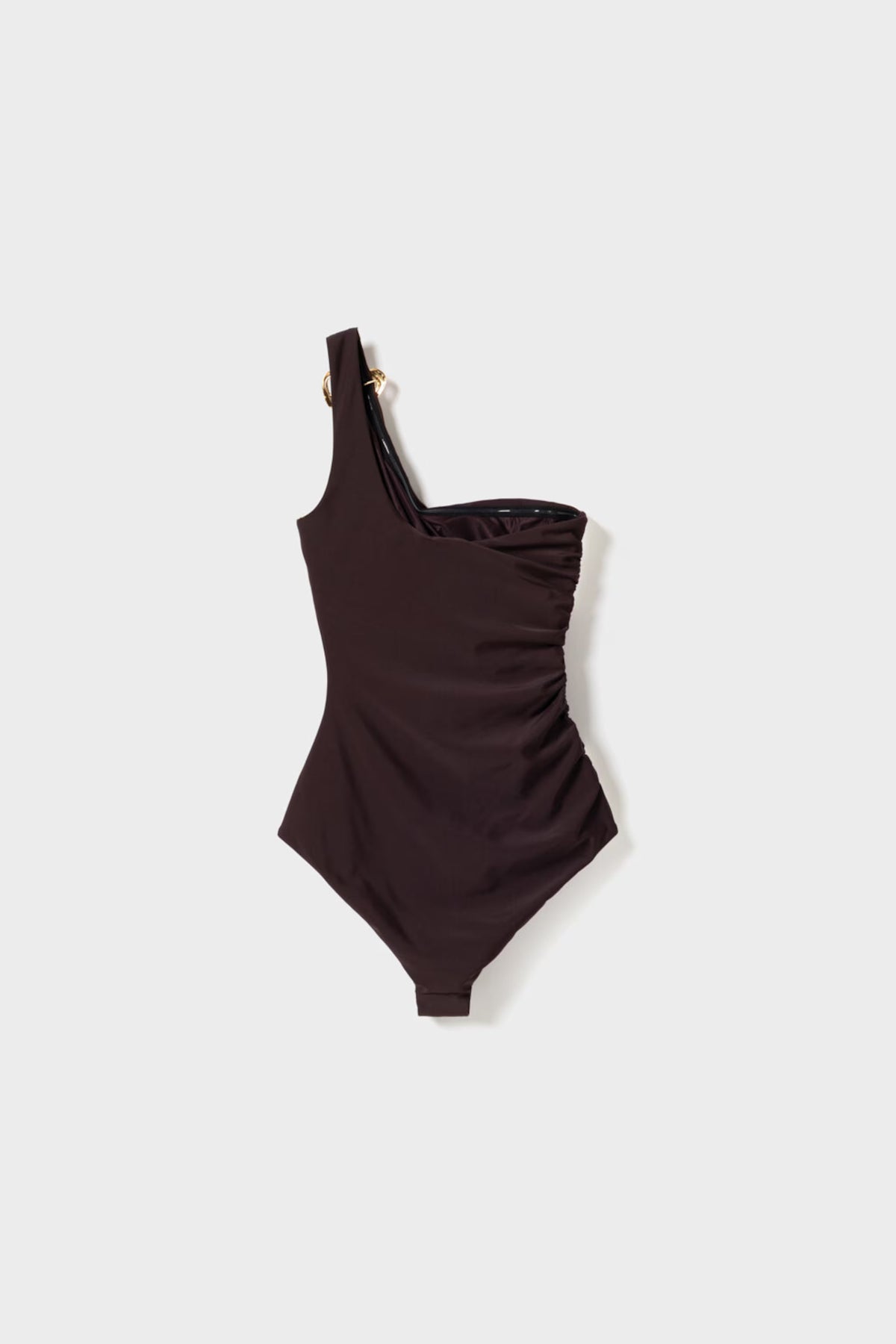 Brauner Badeanzug von Twist & Tango, gefertigt aus 80 % Nylon und 20 % Spandex. Der Badeanzug hat einen Off-Shoulder-Ausschnitt und einen tiefbraunen Farbton.